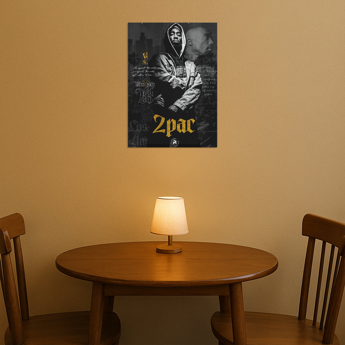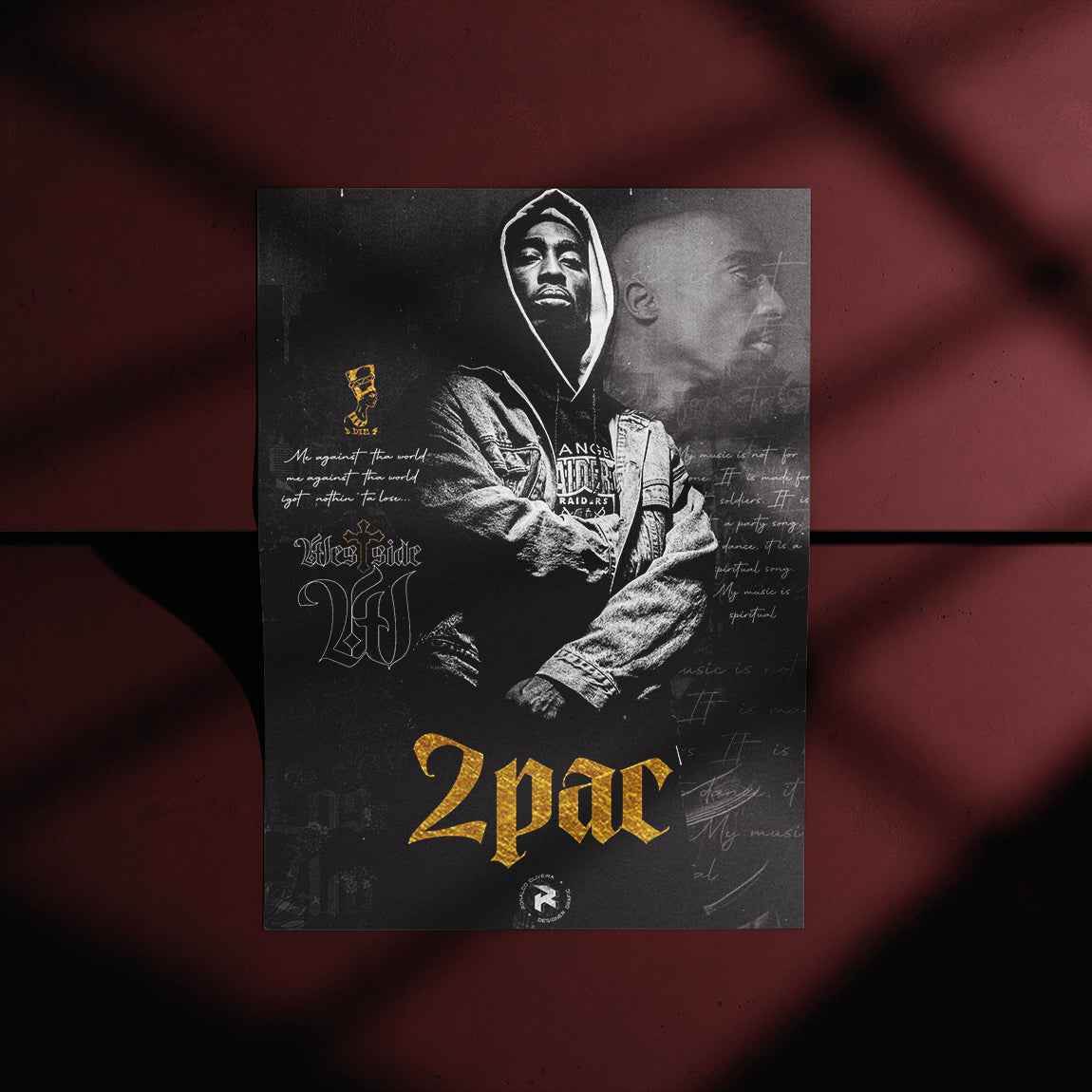 Powerful black and gold design honoring 2Pac’s iconic West Coast style and legacy. Features layered portraits and handwritten text accents.