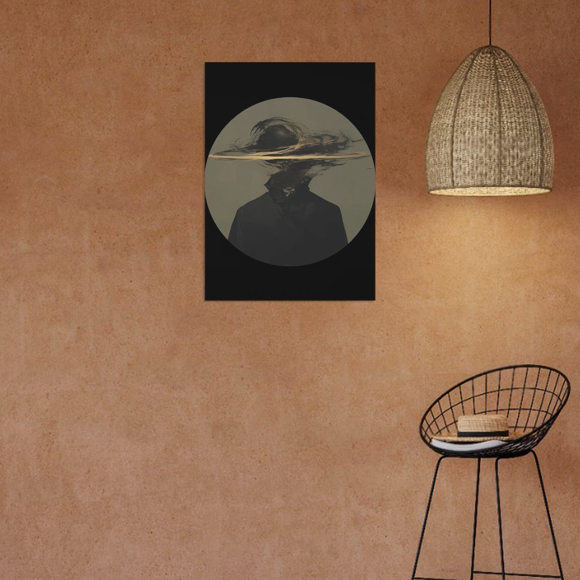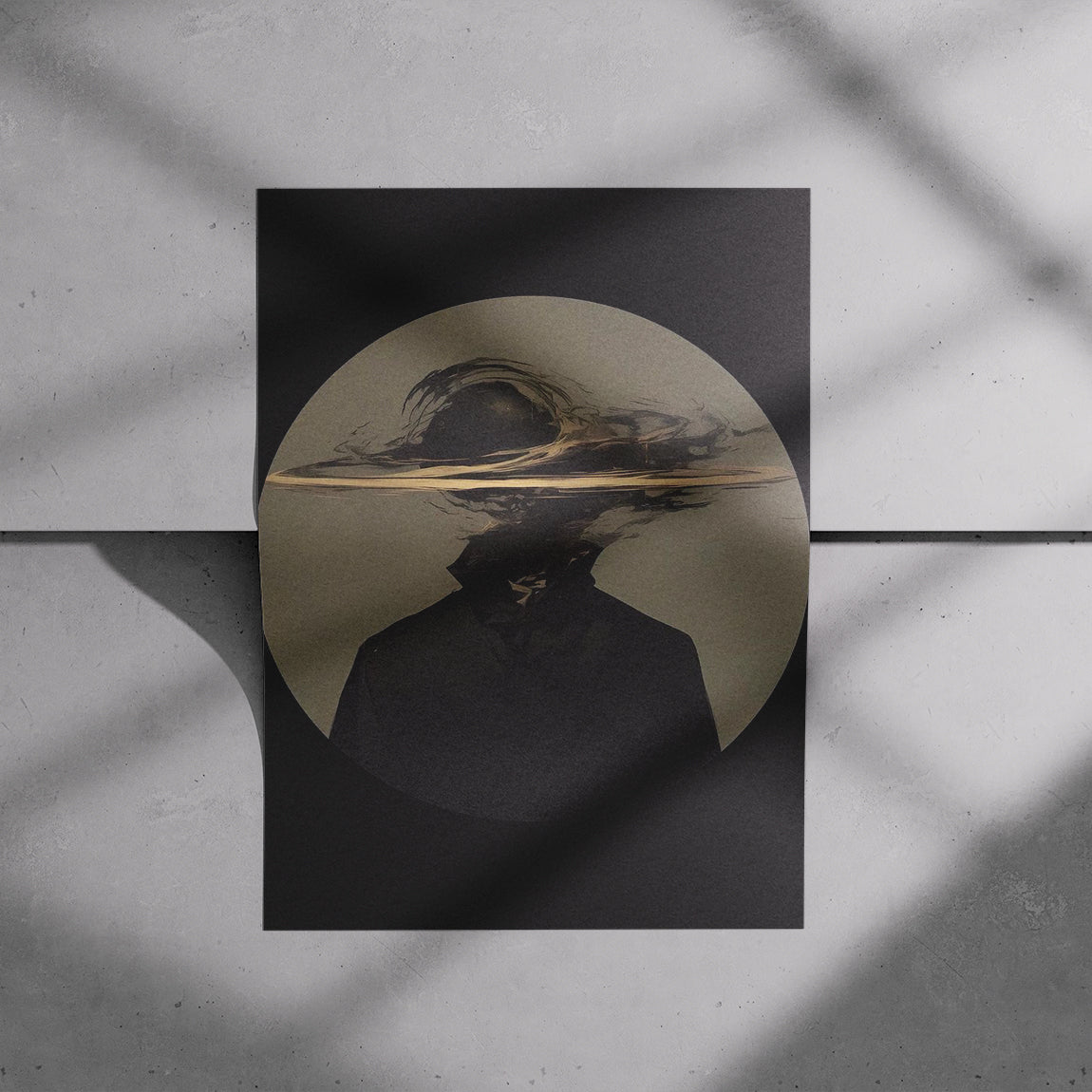 A mysterious wanderer with a swirling golden horizon crossing their face. An abstract design evoking mystery and artistic depth.