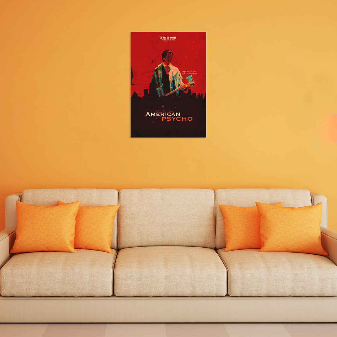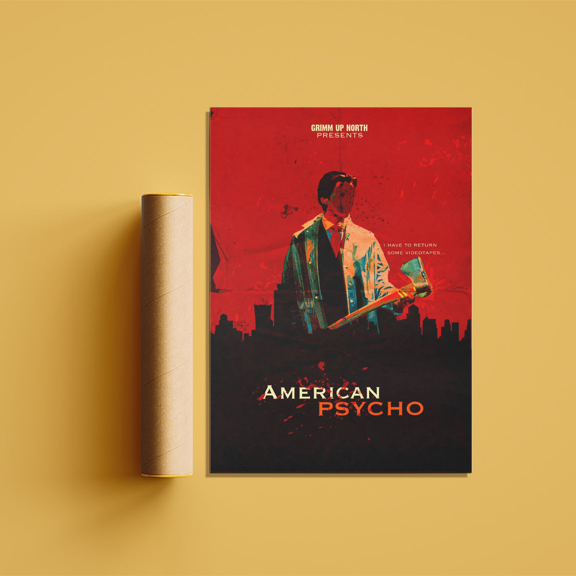 A bold red poster featuring the chilling silhouette of Patrick Bateman.