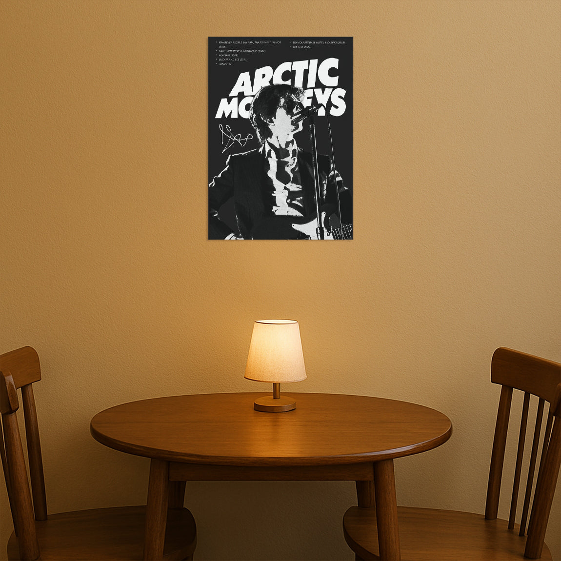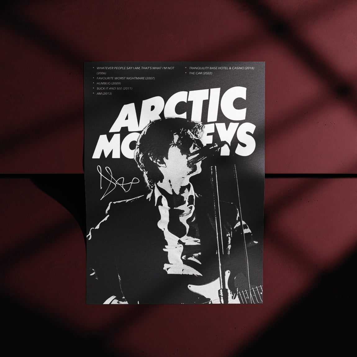 Bold black and white poster of Arctic Monkeys’ lead singer performing, paired with large logo and album references. Classic and timeless.