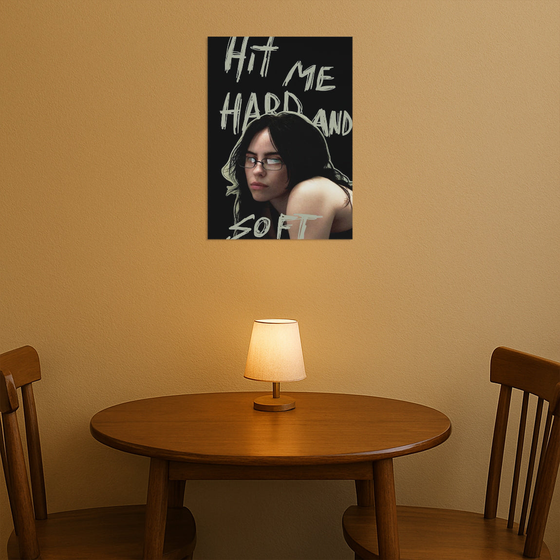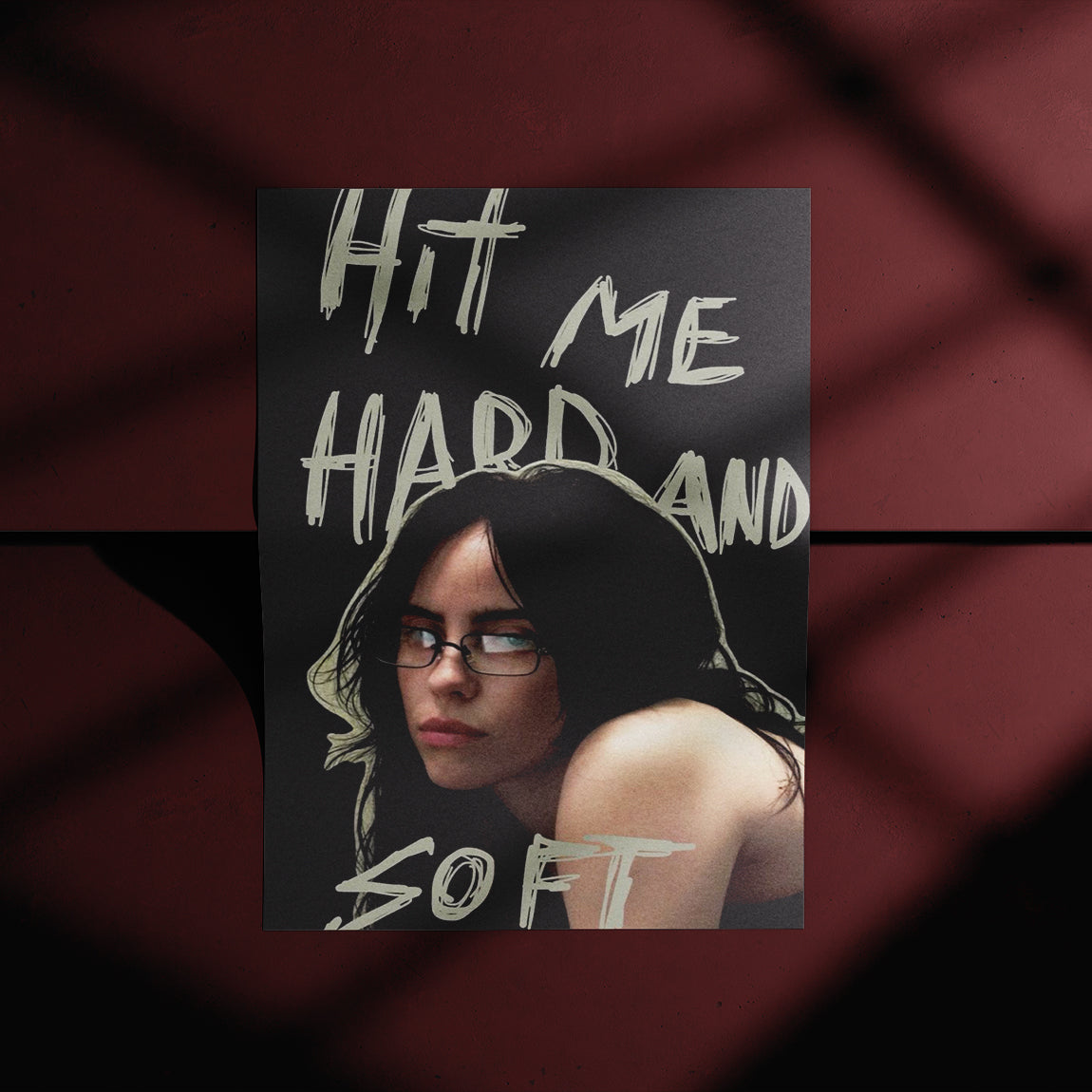 Expressive design inspired by Billie Eilish’s "Hit Me Hard and Soft," featuring a laid-back portrait with bold handwritten typography.