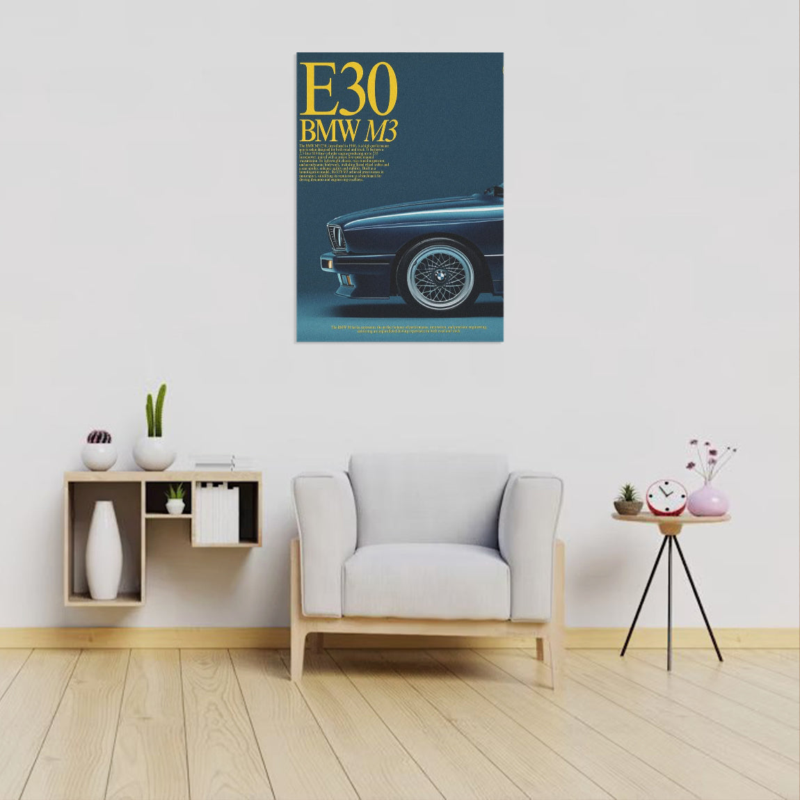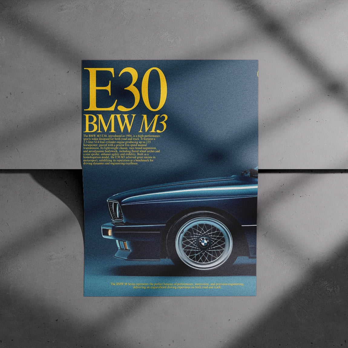 Elegant side profile illustration of the BMW E30 M3 in deep blue tones. Highlights its performance-focused styling and classic lines.