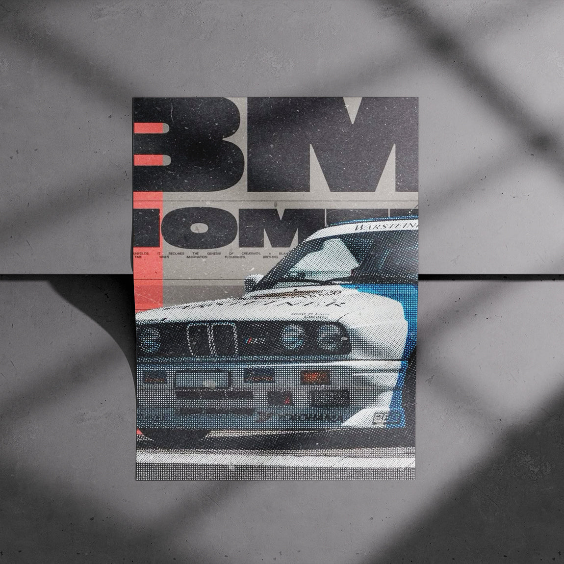 A bold halftone rendering merges classic BMW grille details with oversized typography for a retro print feel.