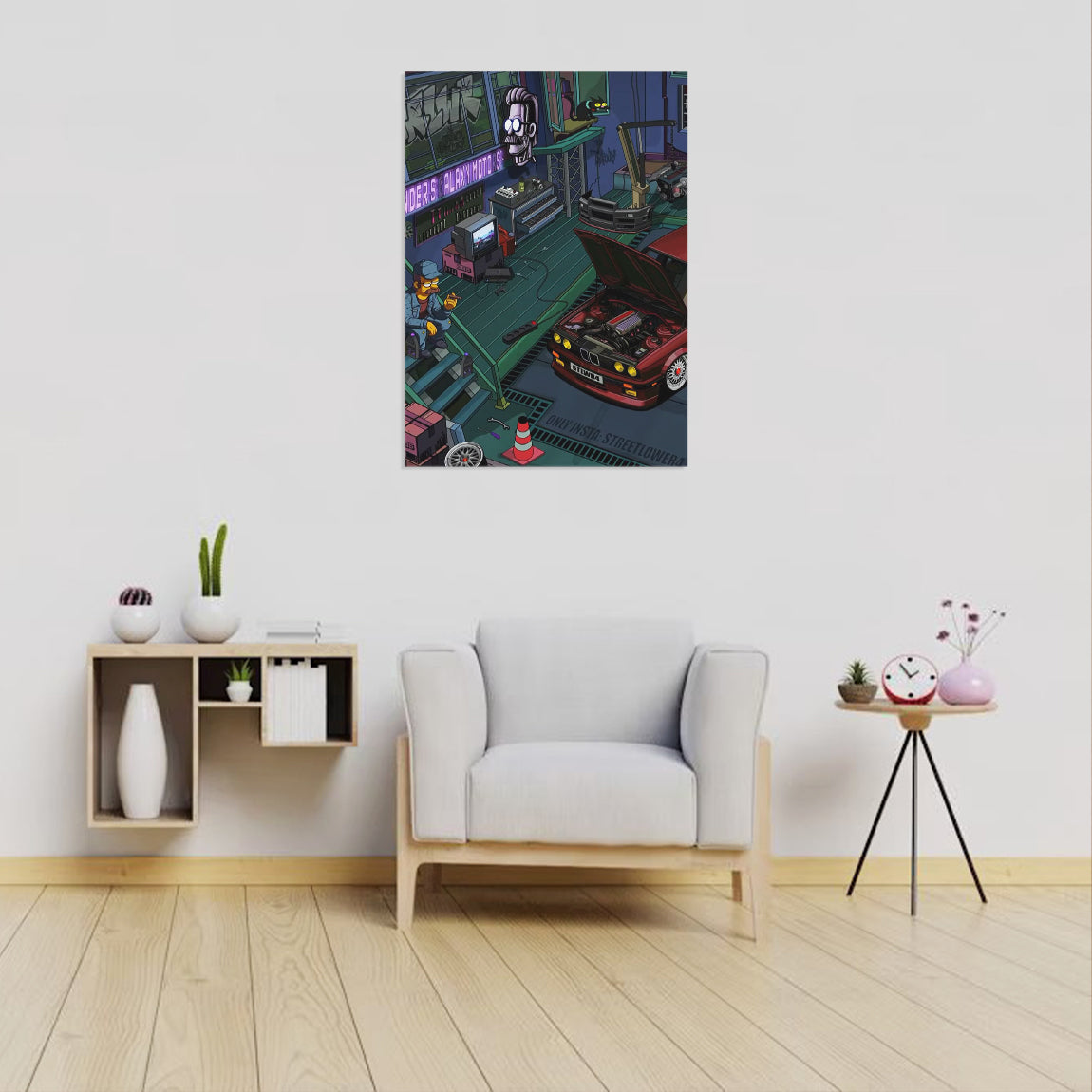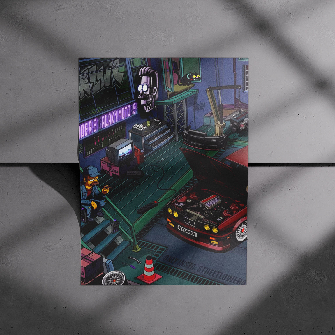Vibrant cartoon illustration brings a retro garage scene to life with a classic tuner car and animated mechanic.