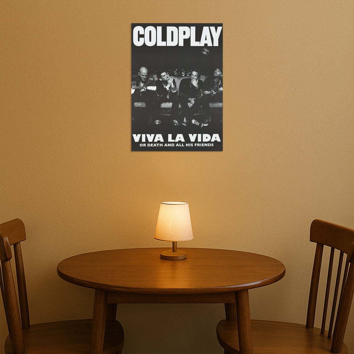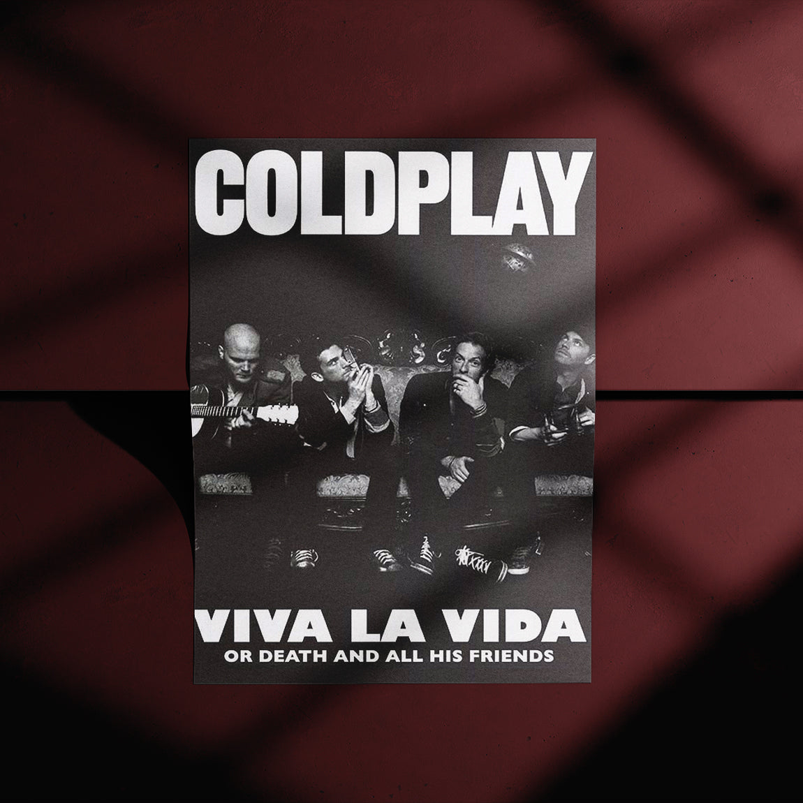 Bold monochrome design featuring Coldplay with "Viva La Vida or Death and All His Friends" text. Classic and powerful tribute to the band.