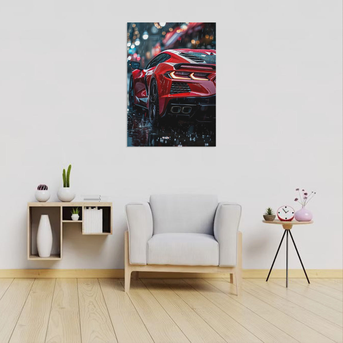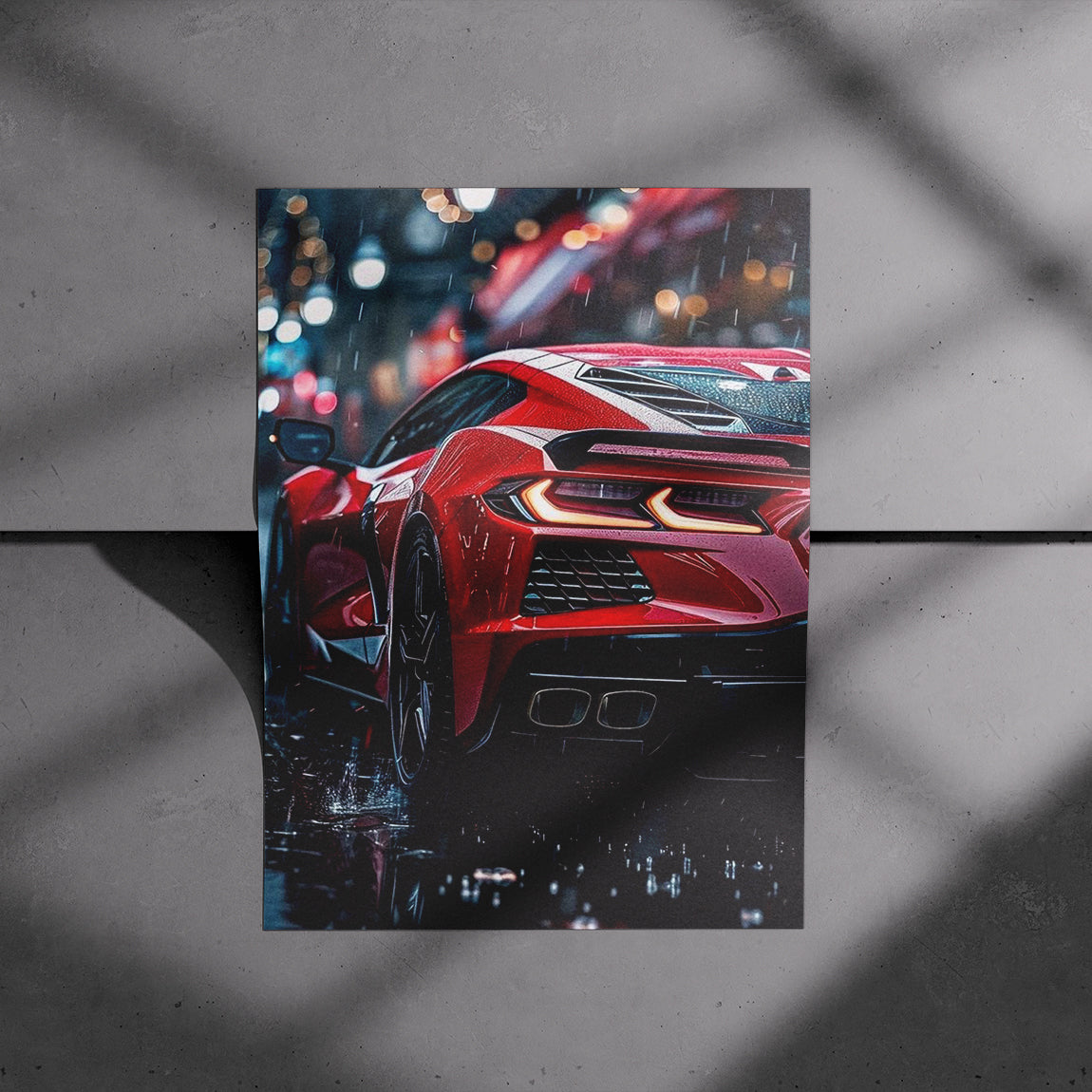 A striking red Corvette C8 glistens under city lights in a gentle rain, each drop adding depth to its bold contours.