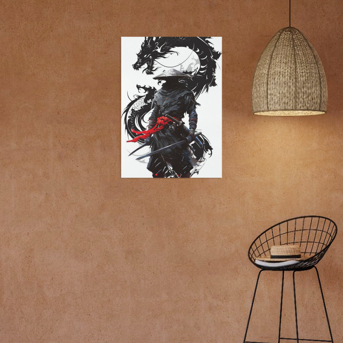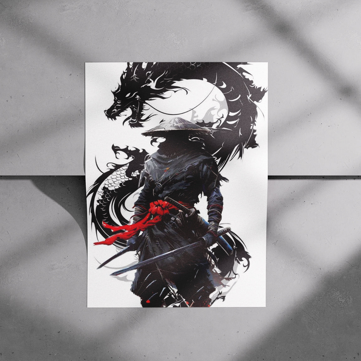 A dynamic ninja with dual swords and a bold red sash stands before an imposing dragon shadow. A fierce, energetic design that commands attention.