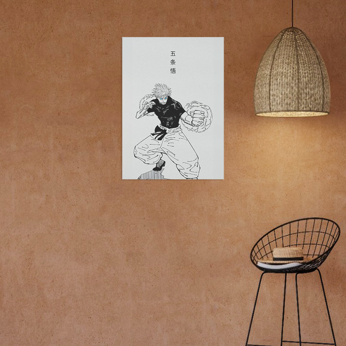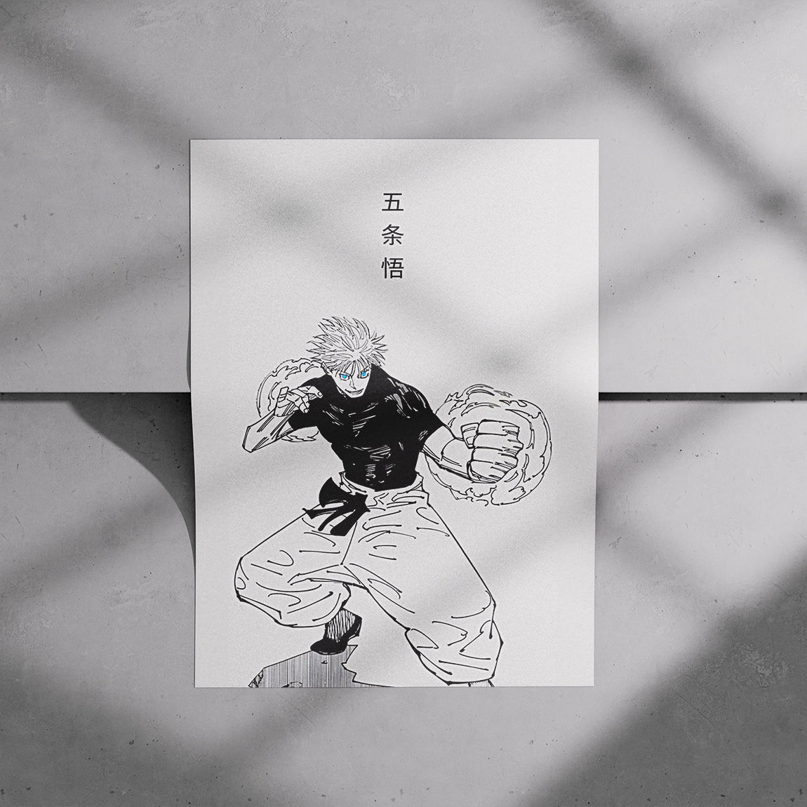 A dynamic black-and-white illustration of Gojo Satoru ready to fight. Intense energy and sharp line work for Jujutsu Kaisen enthusiasts.