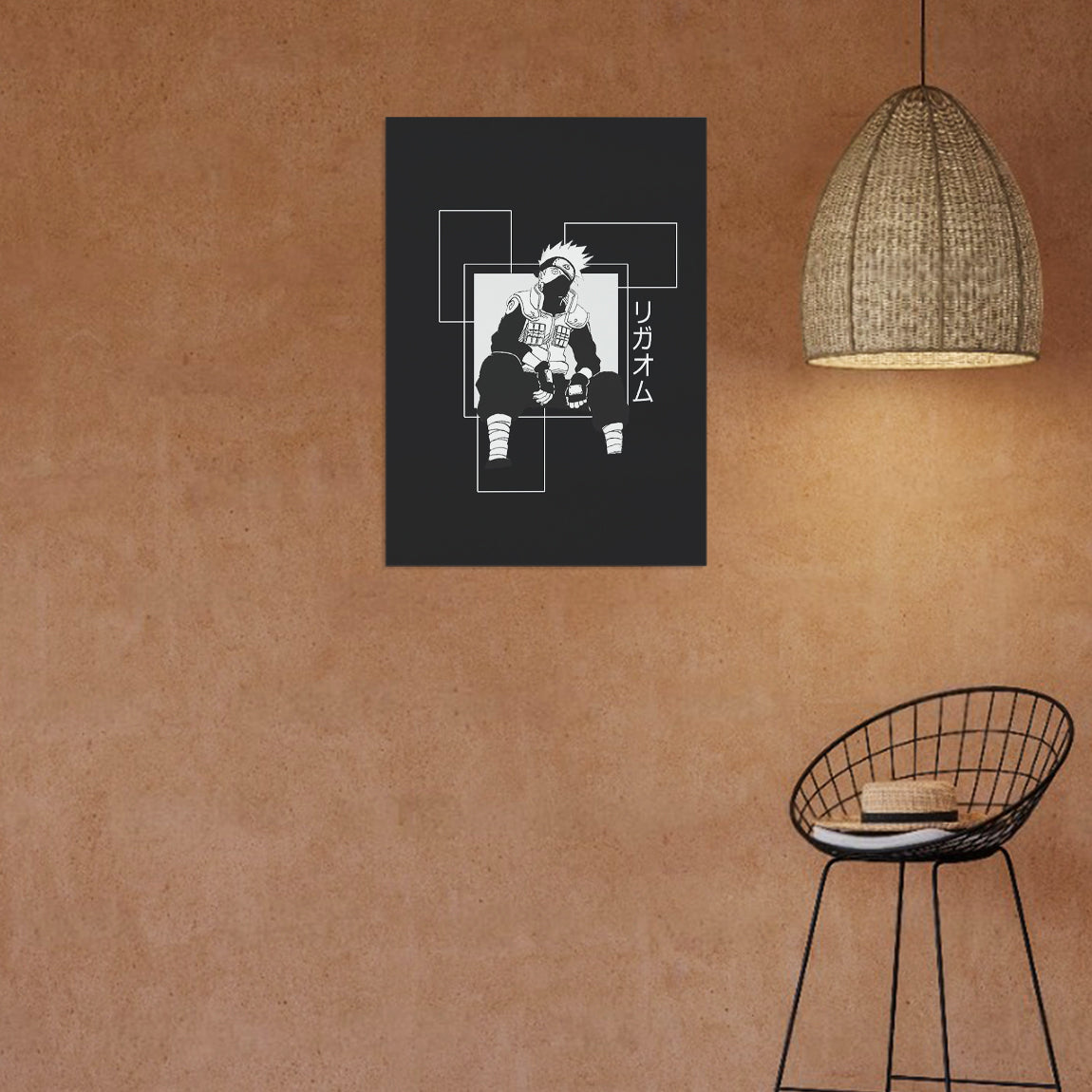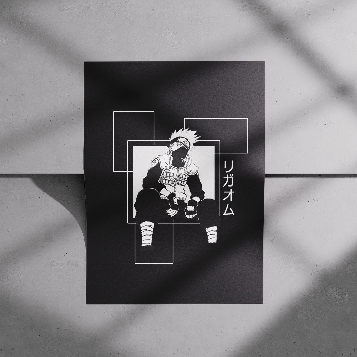 A minimalistic black-and-white design of Kakashi Hatake sitting calmly. Geometric accents add modern aesthetic to this stylish piece.