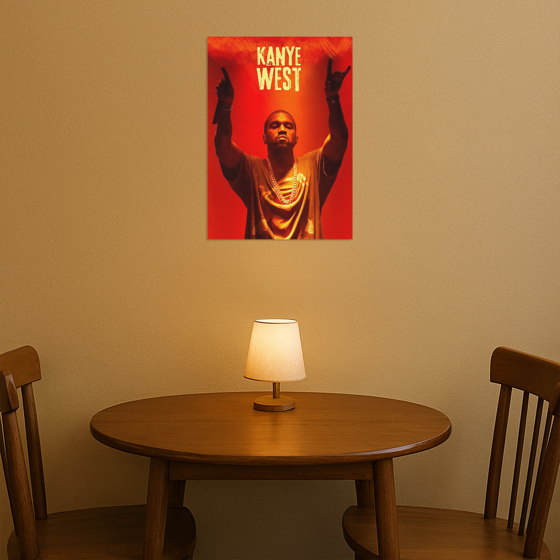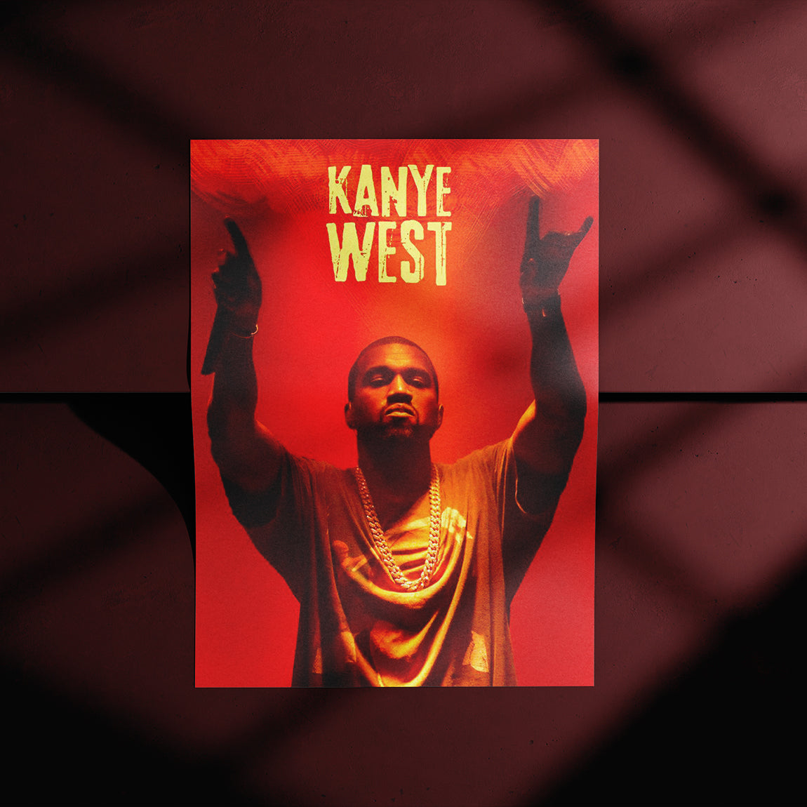 Dramatic red and orange stage poster of Kanye West in a powerful performing pose. Minimal text for a bold, iconic feel.