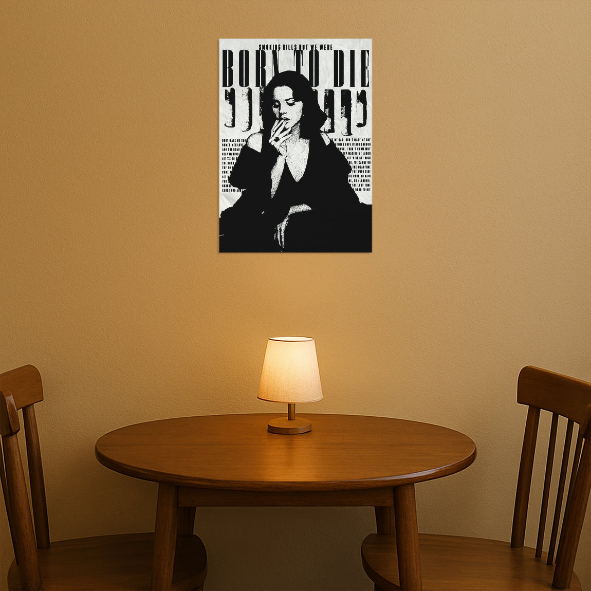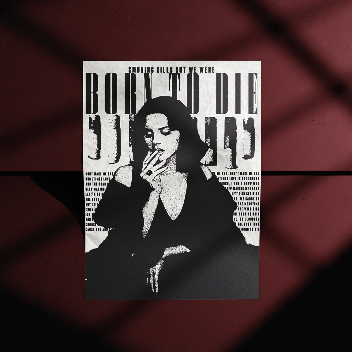 Striking monochrome artwork of Lana Del Rey with bold "Born To Die" typography and vintage grainy effect. Evokes a moody, retro aesthetic.