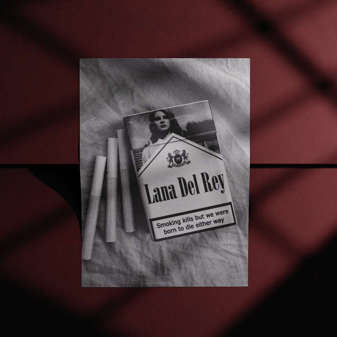 Edgy black and white design featuring a Lana Del Rey-themed cigarette pack, symbolizing her iconic melancholic style. Bold and eye-catching.