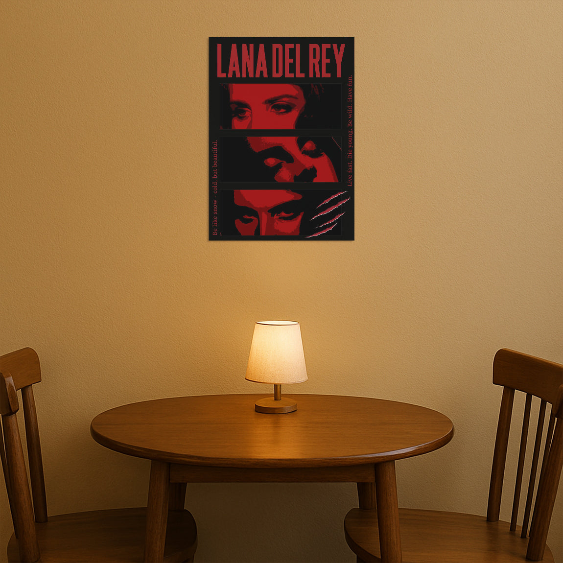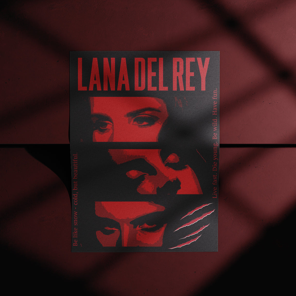 Bold red and black poster with fragmented close-ups of Lana Del Rey’s eyes and artistic text accents. Striking and modern.