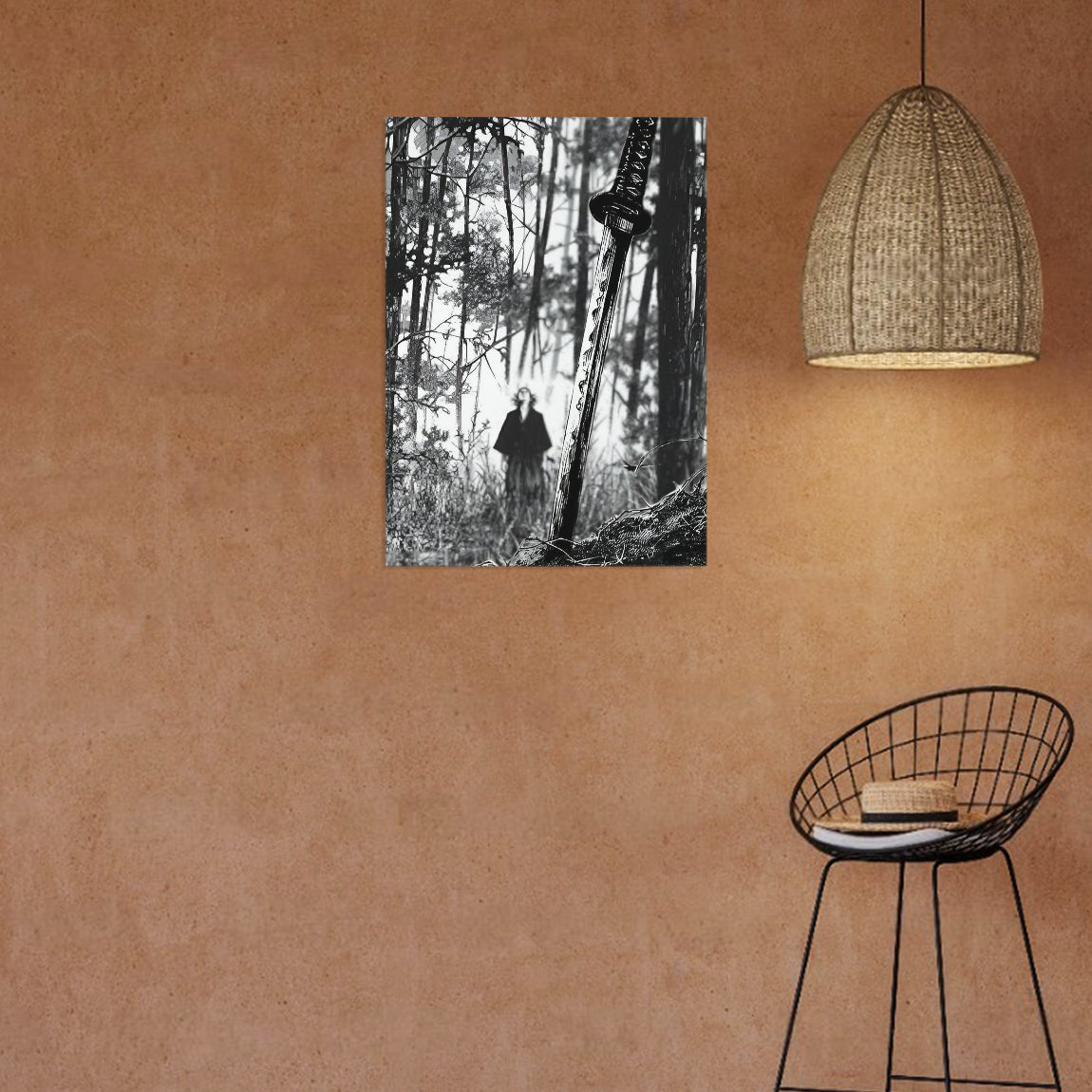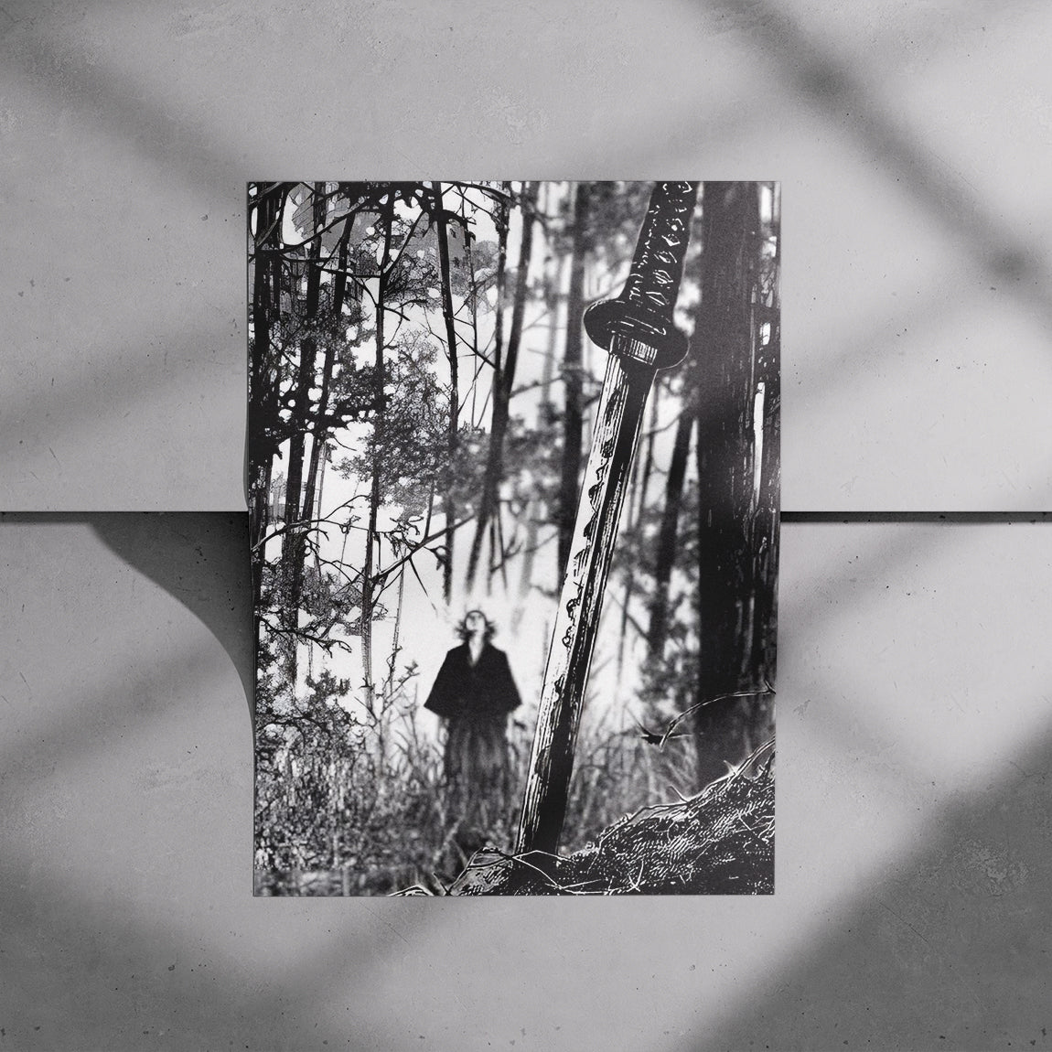 A striking black-and-white forest scene with a large katana in focus and a distant figure. Deep, mysterious, and cinematic.