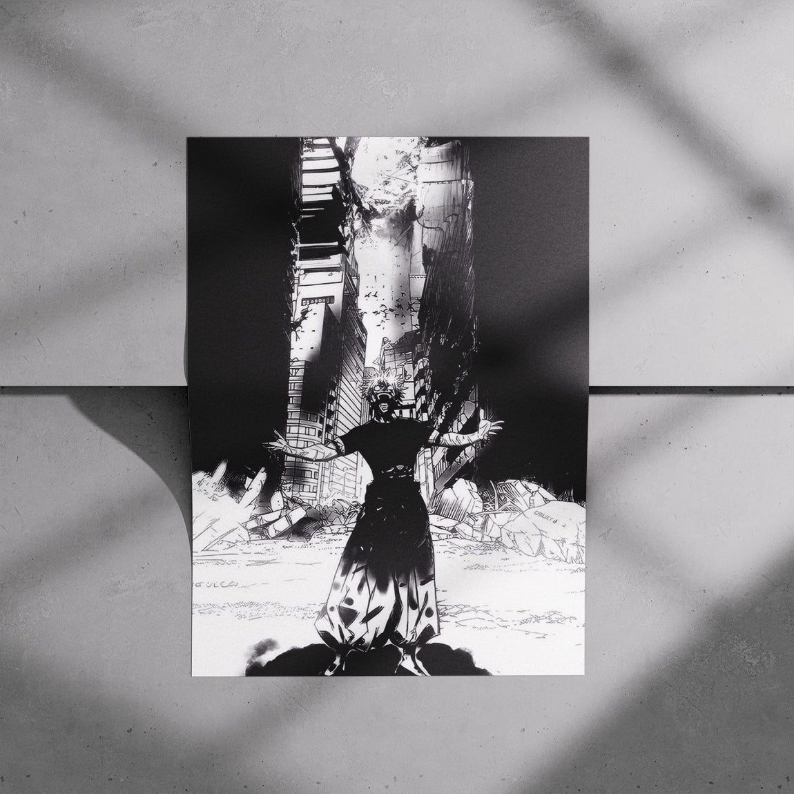 A dramatic manga scene of a figure screaming in rage amidst a crumbling cityscape. Bold contrast and intense emotion.