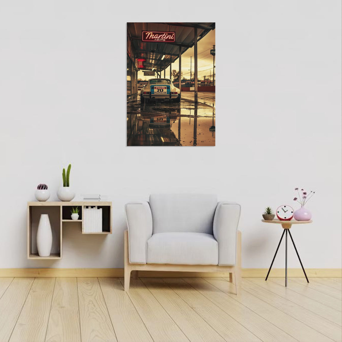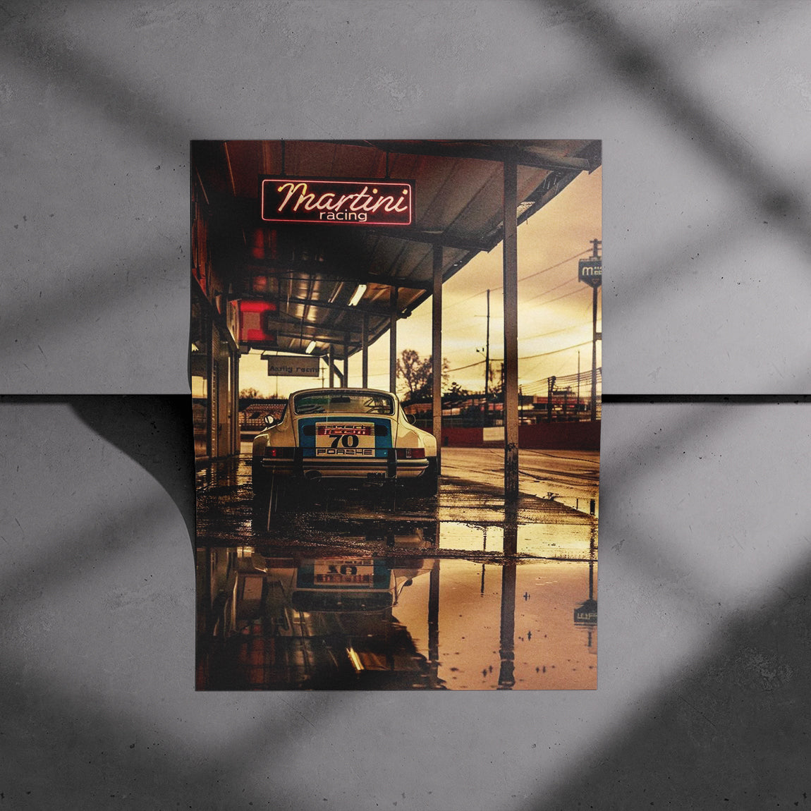 A classic Porsche with Martini Racing livery reflects perfectly in rain-soaked pavement beneath neon signage.