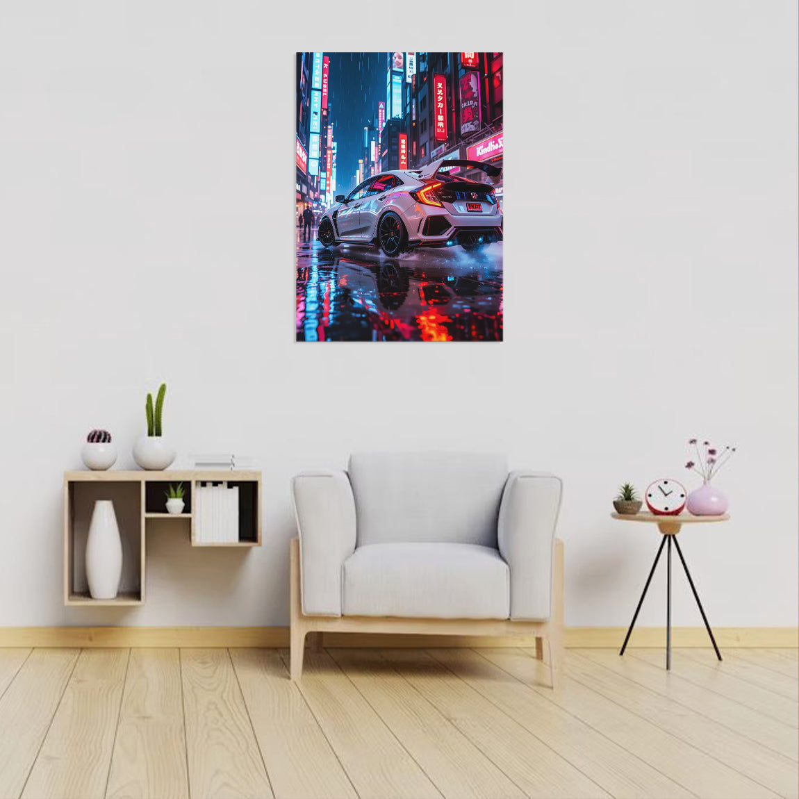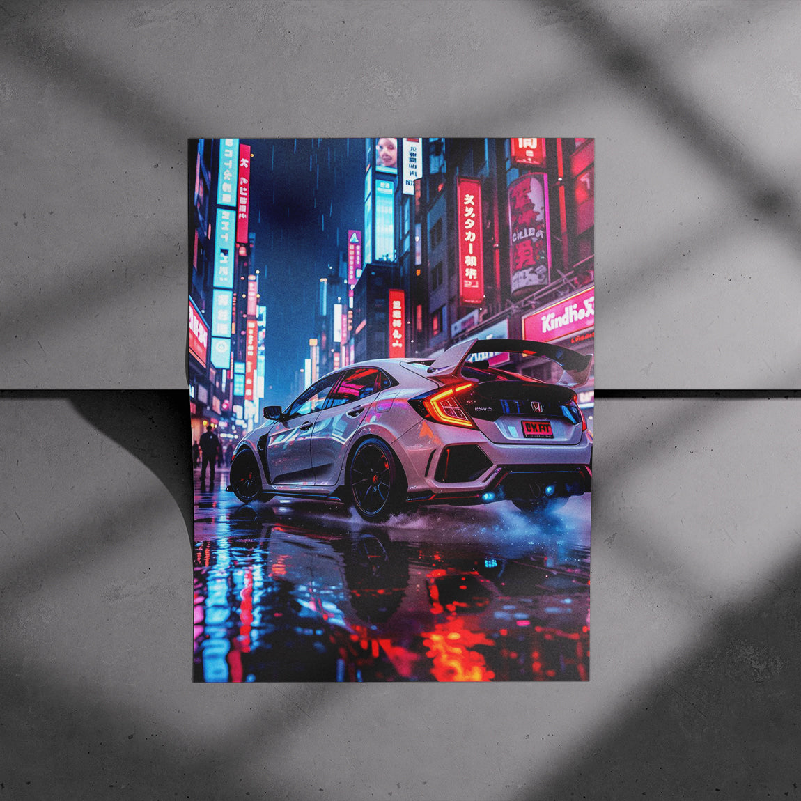 A tuned Honda Civic Type R cuts through a rain-slicked Tokyo avenue under vivid neon signs and glistening reflections.