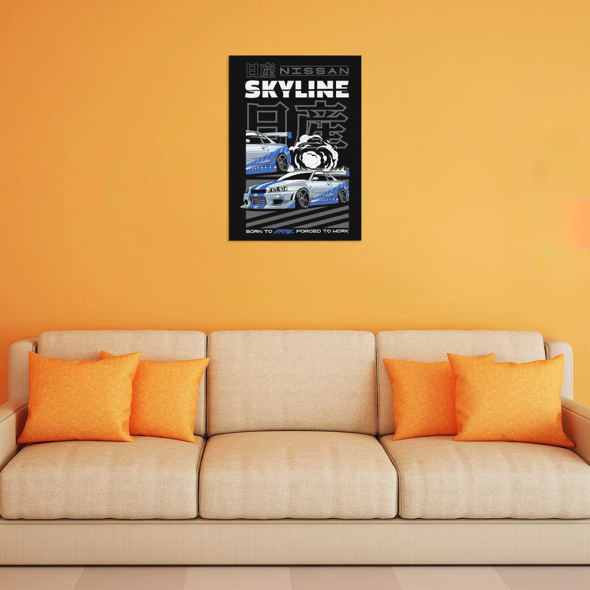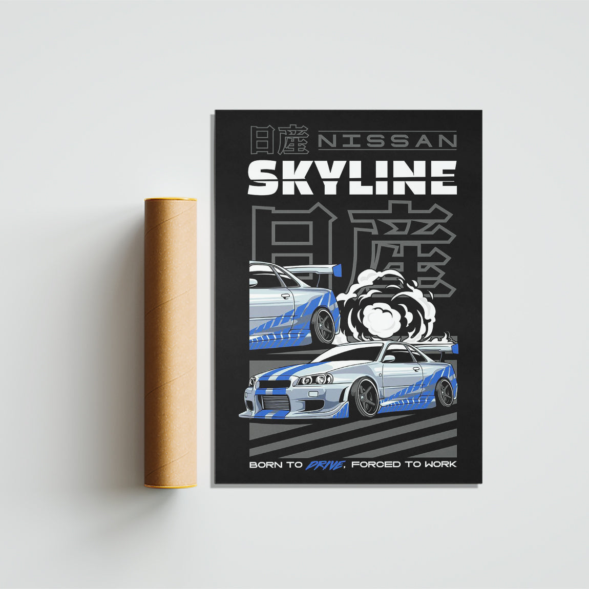 A dynamic illustration of two Nissan Skylines in a drifting scene, accented with smoke, Japanese text, and striking blue highlights.