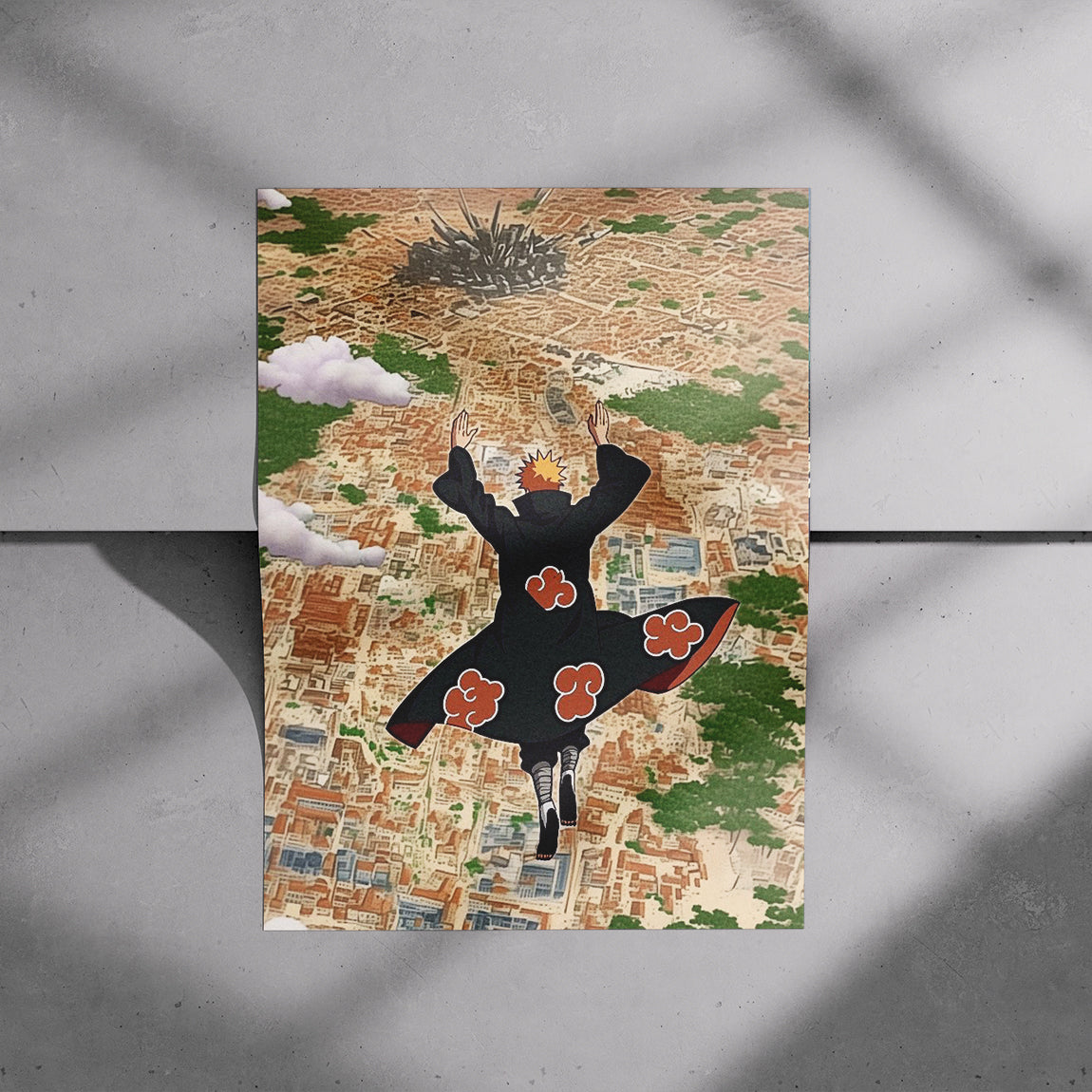 A dramatic scene of Pain overlooking a destroyed city in Naruto. Powerful, symbolic, and strikingly detailed for true fans.