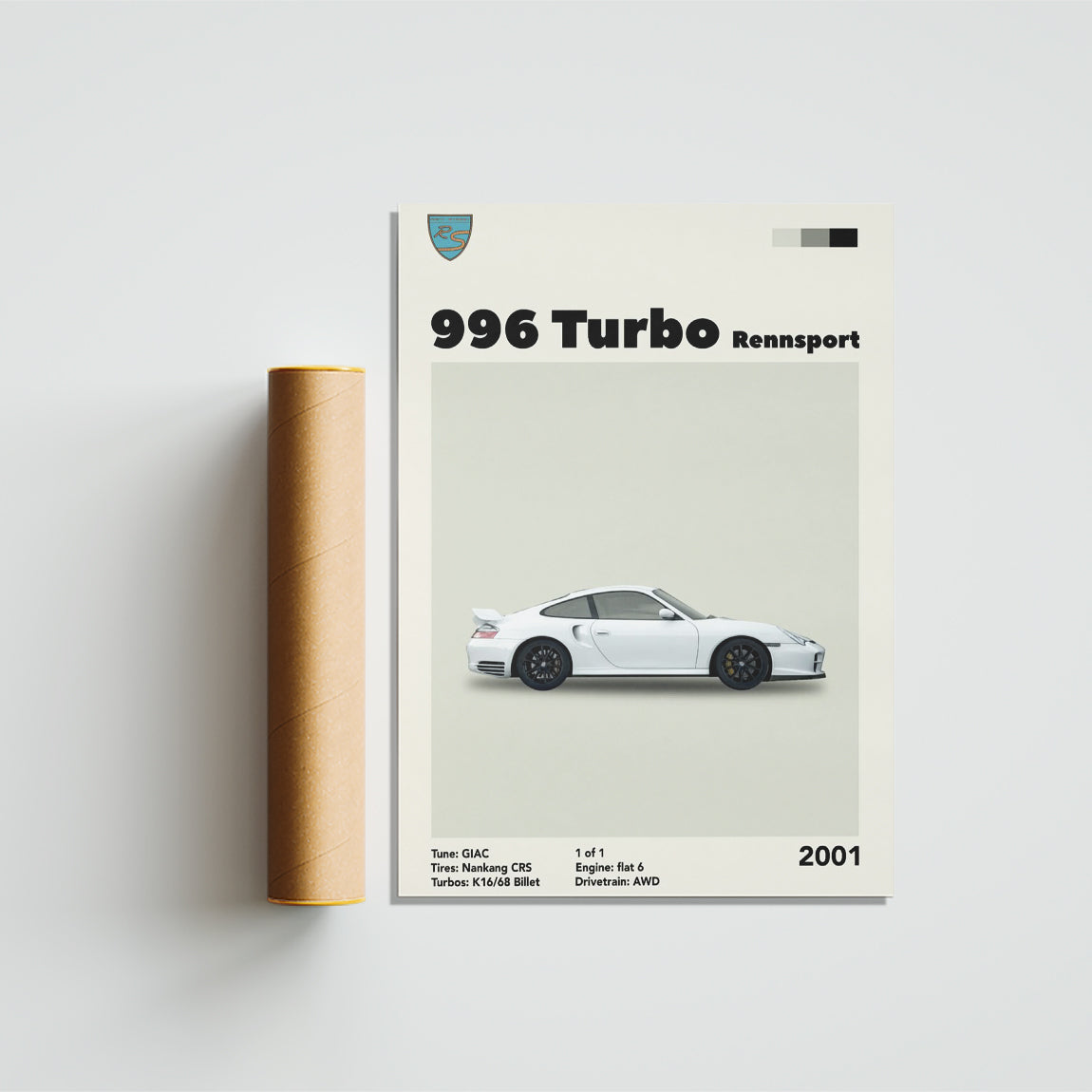 A minimalist depiction of the Porsche 996 Turbo, with clean lines and subtle color tones, emphasizing the sleek design of this renowned sports car.