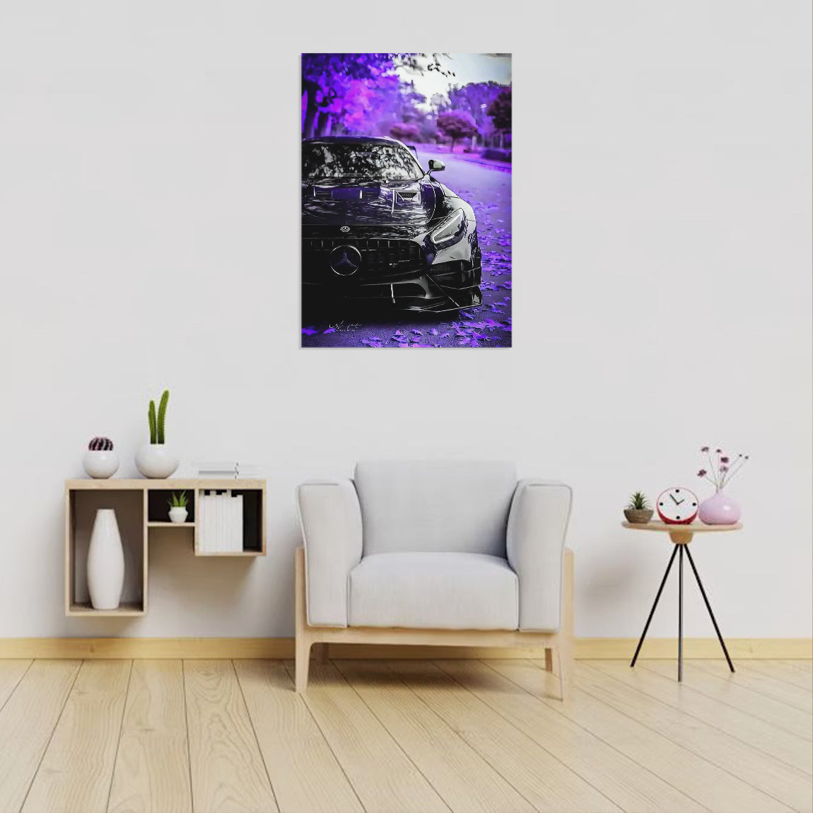 A commanding Mercedes-AMG prowls a neon-lit street bathed in rich purples, its silhouette radiating power and luxury.