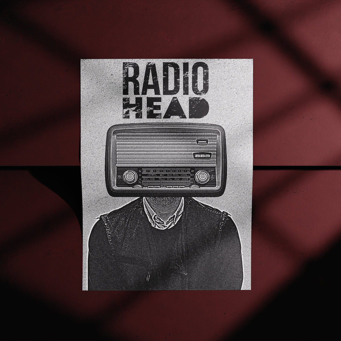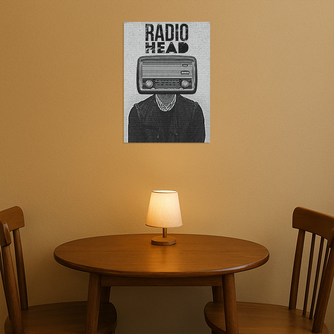 Surreal and creative artwork with an old radio replacing the head, referencing Radiohead’s avant-garde image. Minimal and thought-provoking.