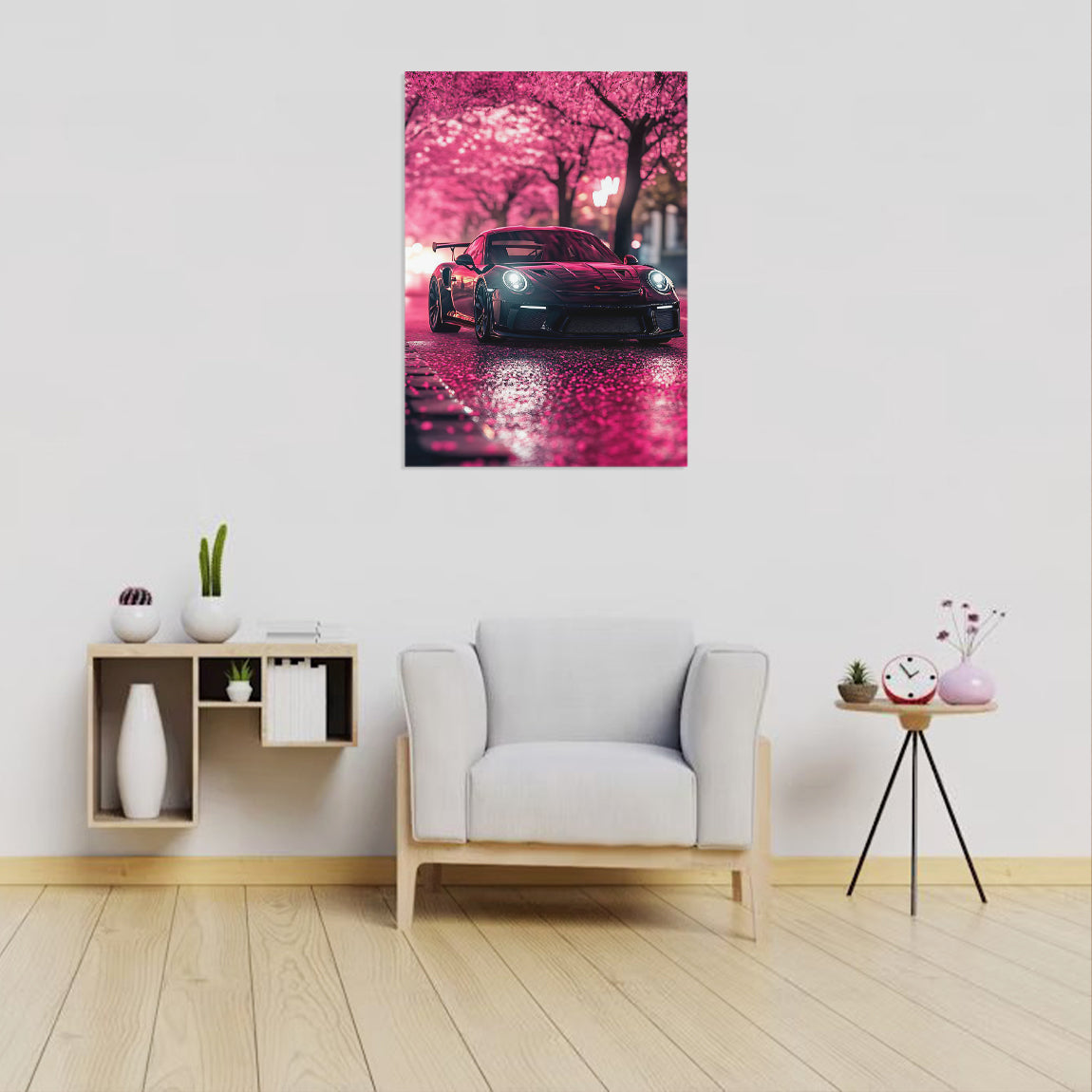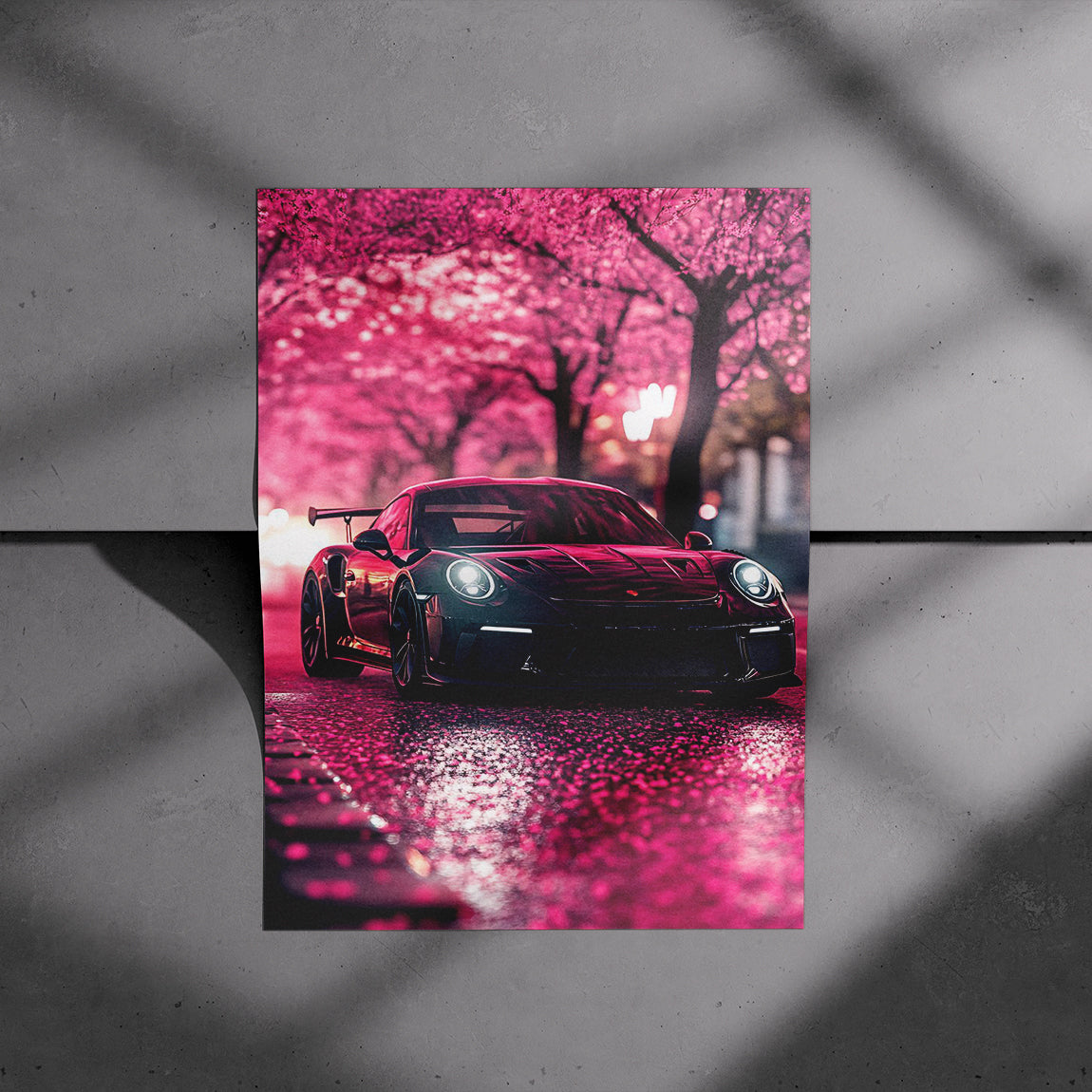 The Porsche 911 GT3 RS prowls a rain-soaked street beneath vibrant cherry blossoms and neon lights.