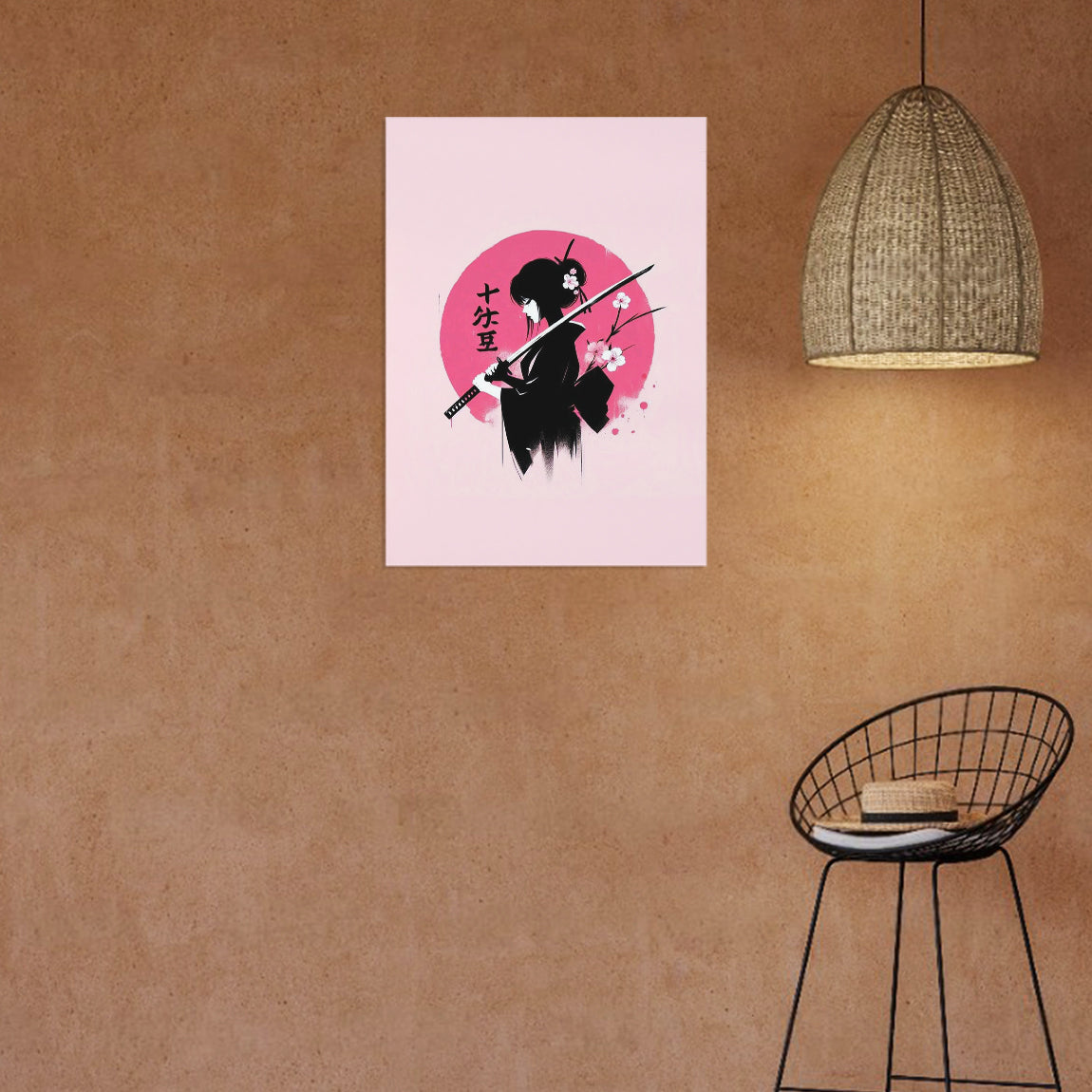 A beautiful poster of a samurai girl with cherry blossoms against a pink circle background. Elegant and modern Japanese aesthetic.
