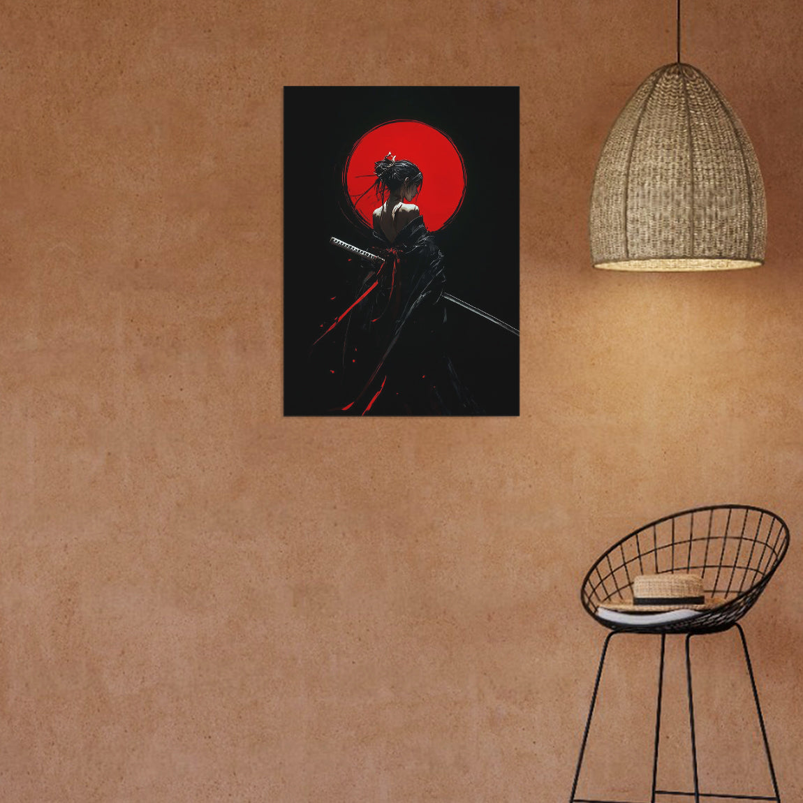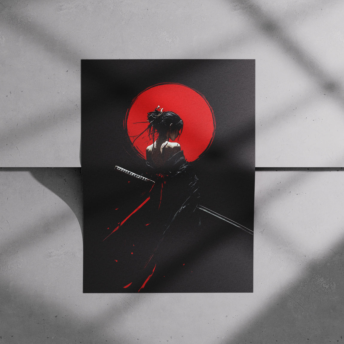 A mysterious silhouette of a samurai standing before a vivid red sun. Bold and powerful design for lovers of Japanese aesthetics.