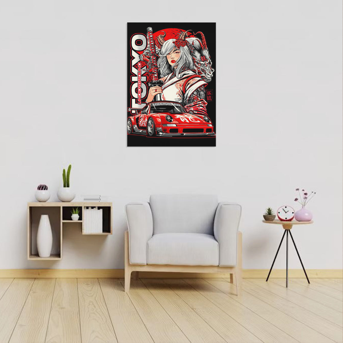 A crimson Porsche 911 GT3 prowls beneath a fierce dragon and a poised samurai warrior, blending modern performance with timeless tradition.