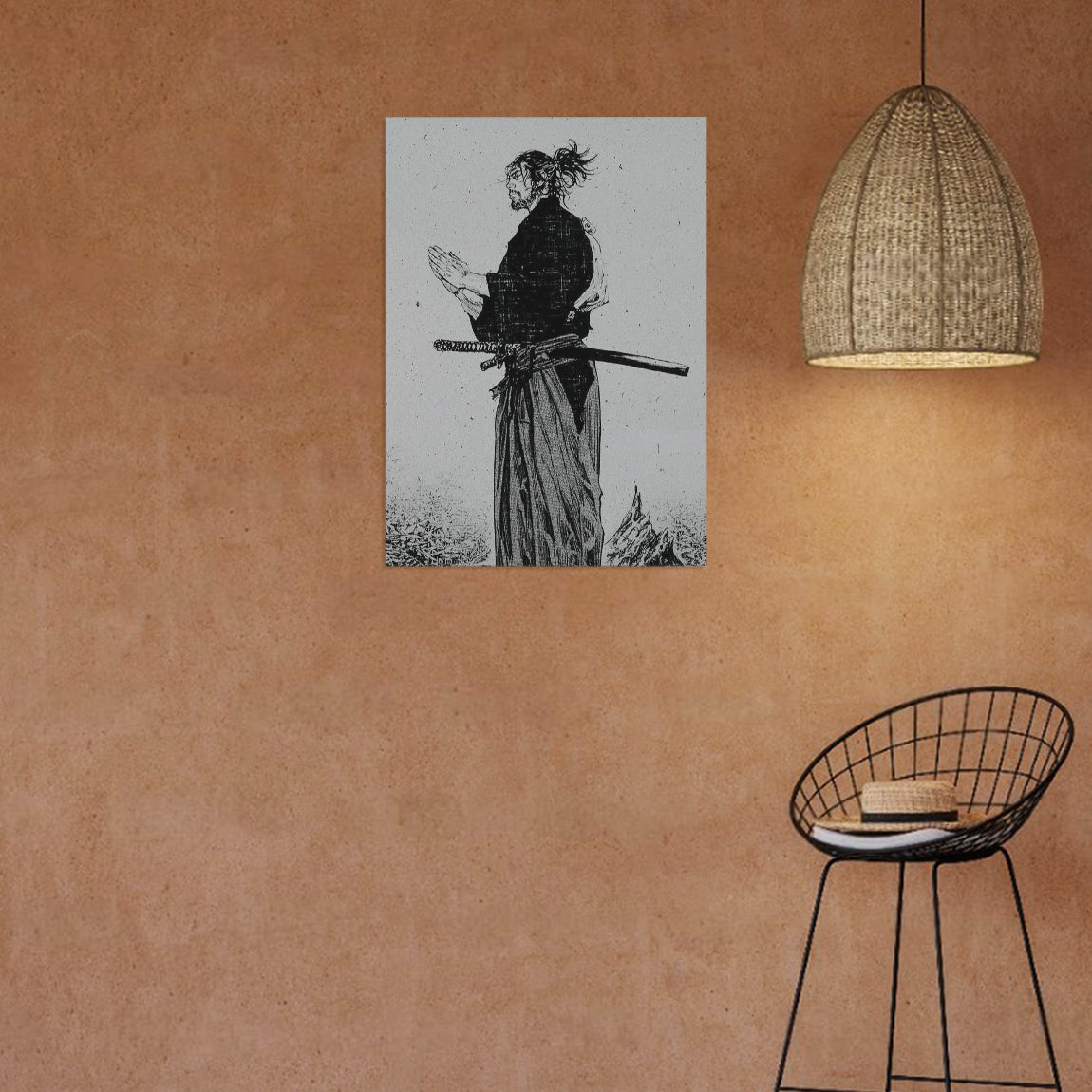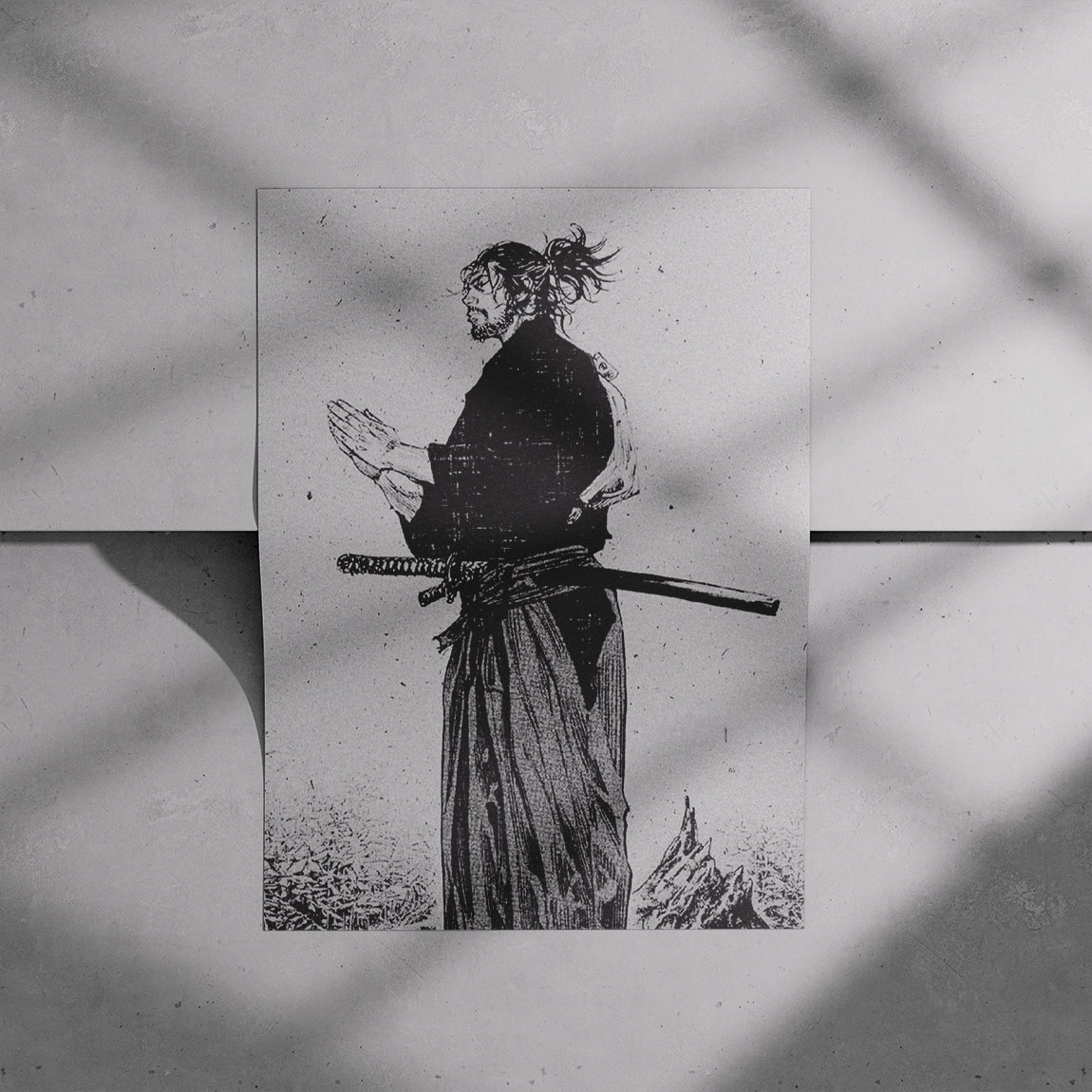 A peaceful and contemplative black-and-white artwork of a samurai in a praying pose. Symbolic and serene for minimalist decor.