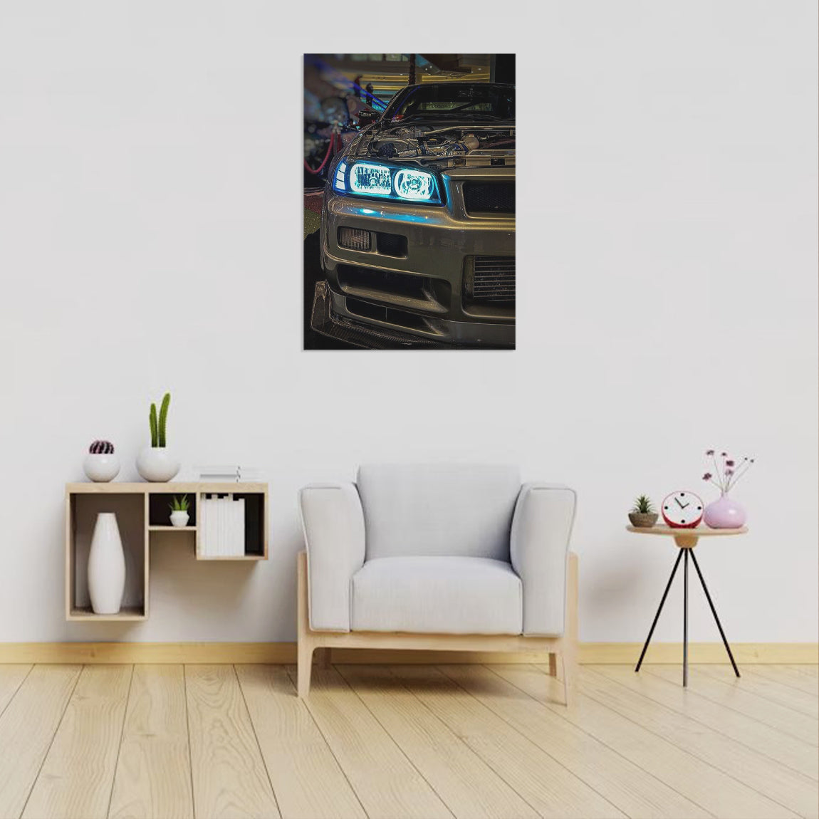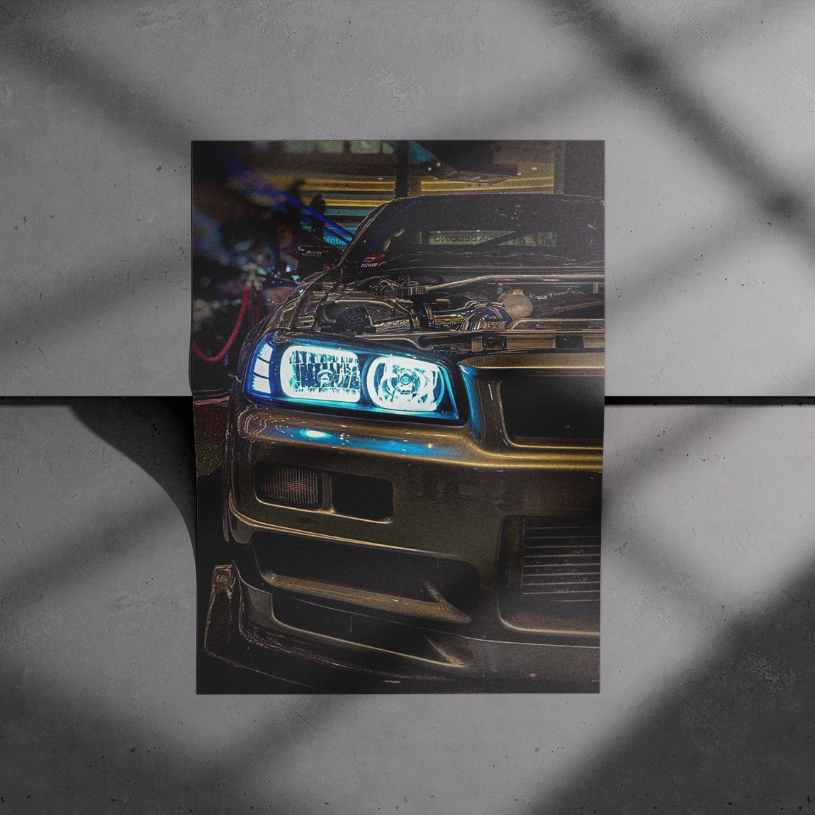 A detailed, high-contrast close-up of an R34’s exposed engine bay and glowing headlights at a nighttime meet.