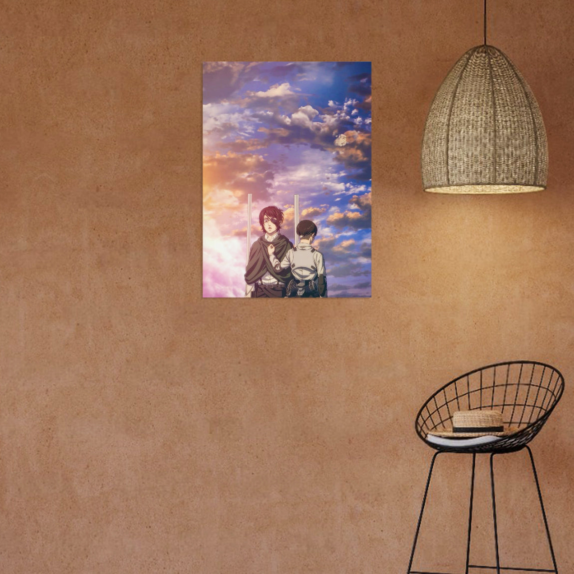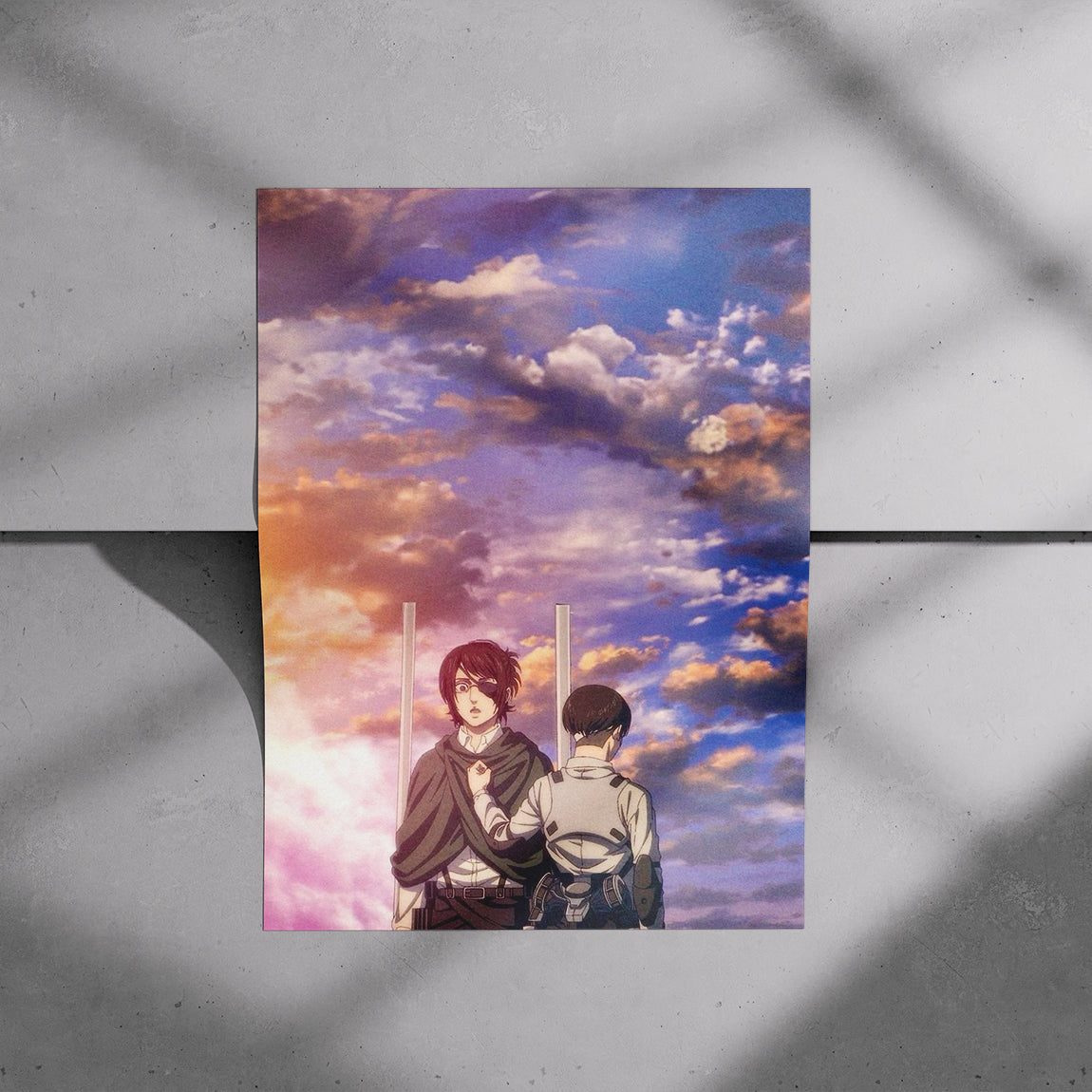 A stunning anime scene of two characters standing under a glowing sunset sky, filled with warmth and emotion.