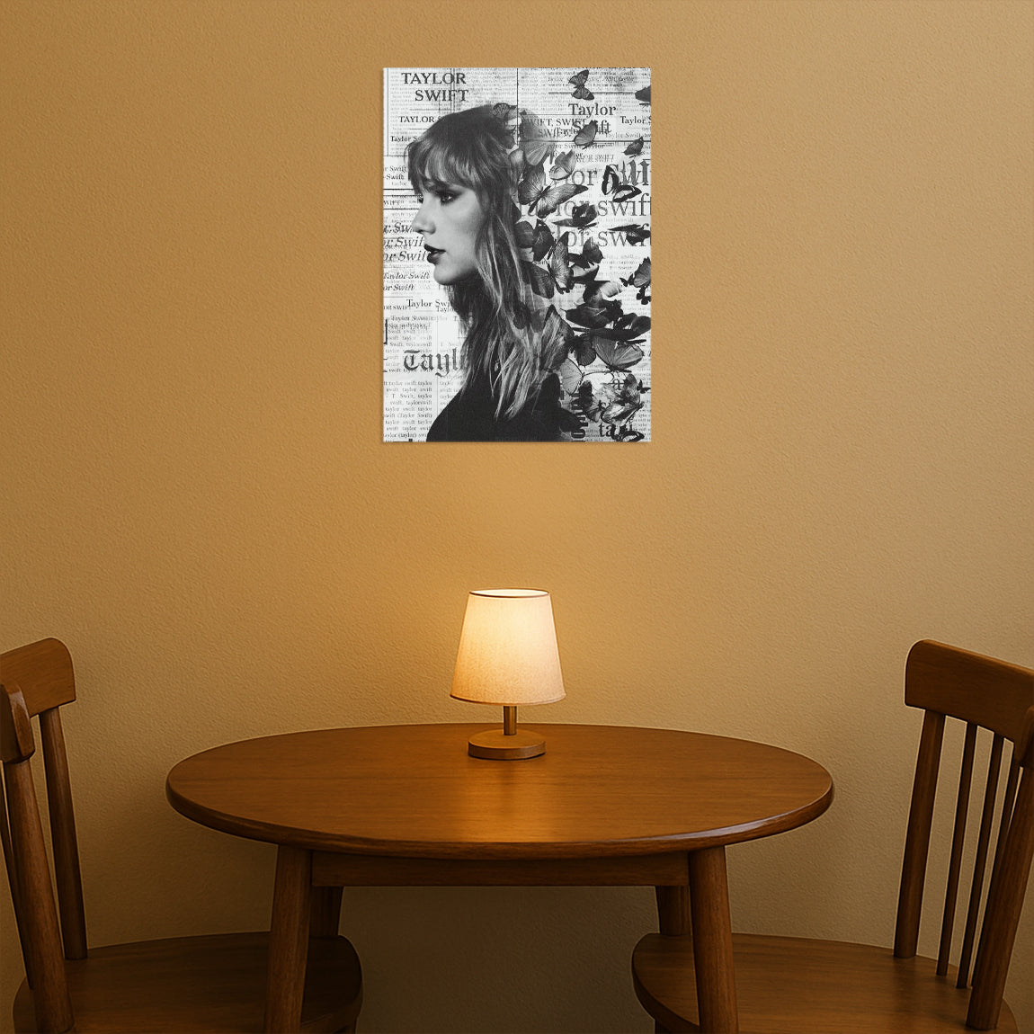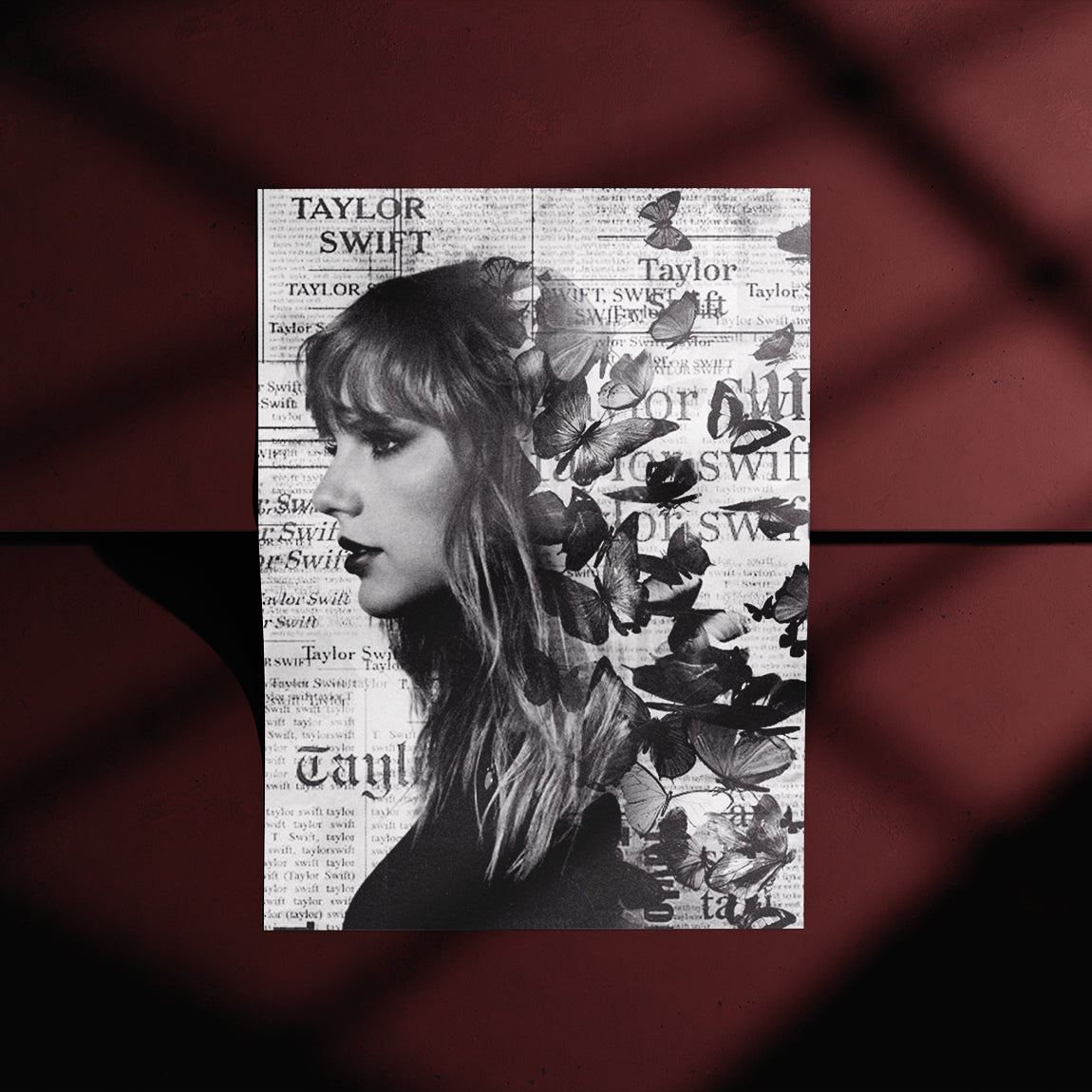 Monochrome design featuring Taylor Swift’s profile surrounded by butterflies and layered newspaper elements. Dreamy and artistic.