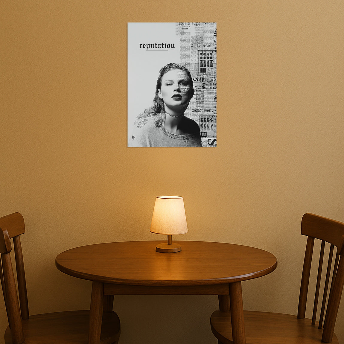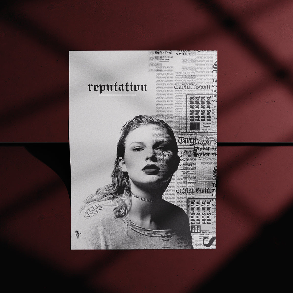 Black and white poster inspired by Taylor Swift’s Reputation era, blending her portrait with vintage newspaper clippings. Elegant and edgy.