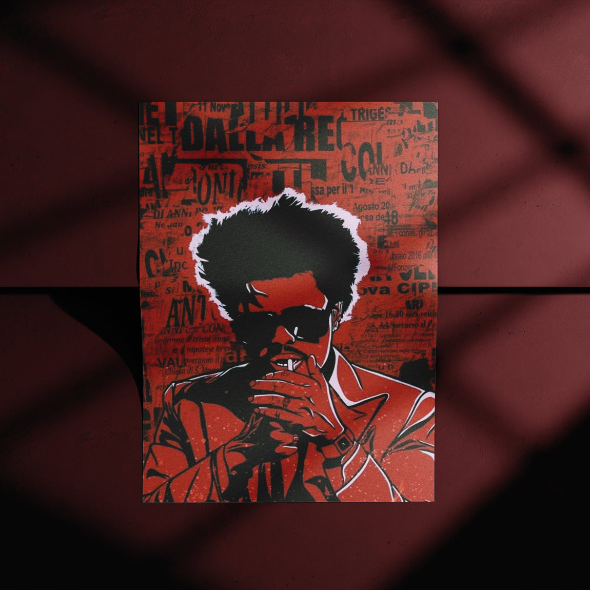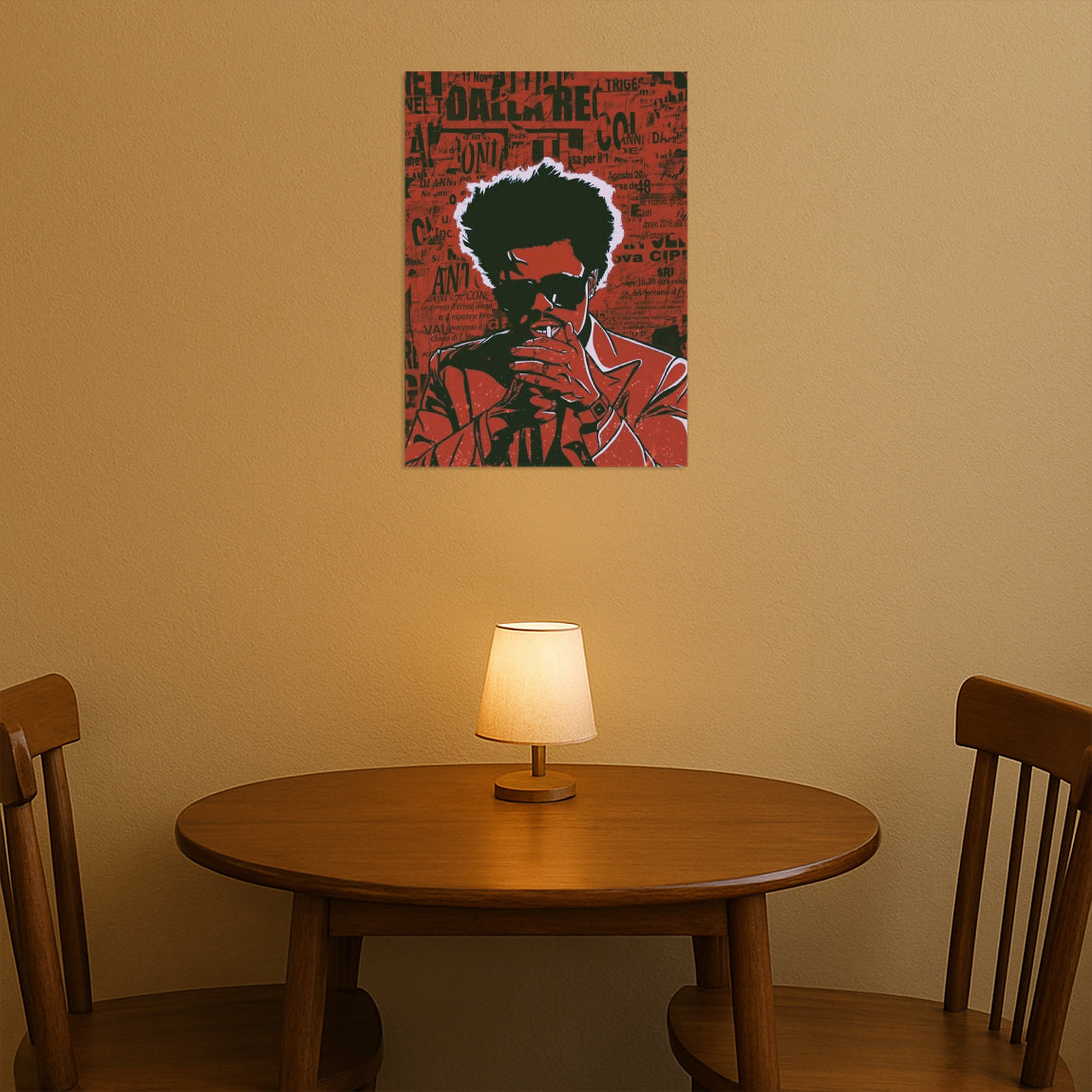 Vivid red-toned graphic poster featuring The Weeknd with bold typography and layered text background. A modern, electrifying statement piece.