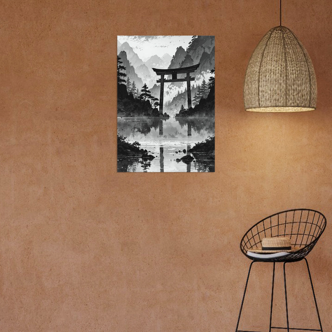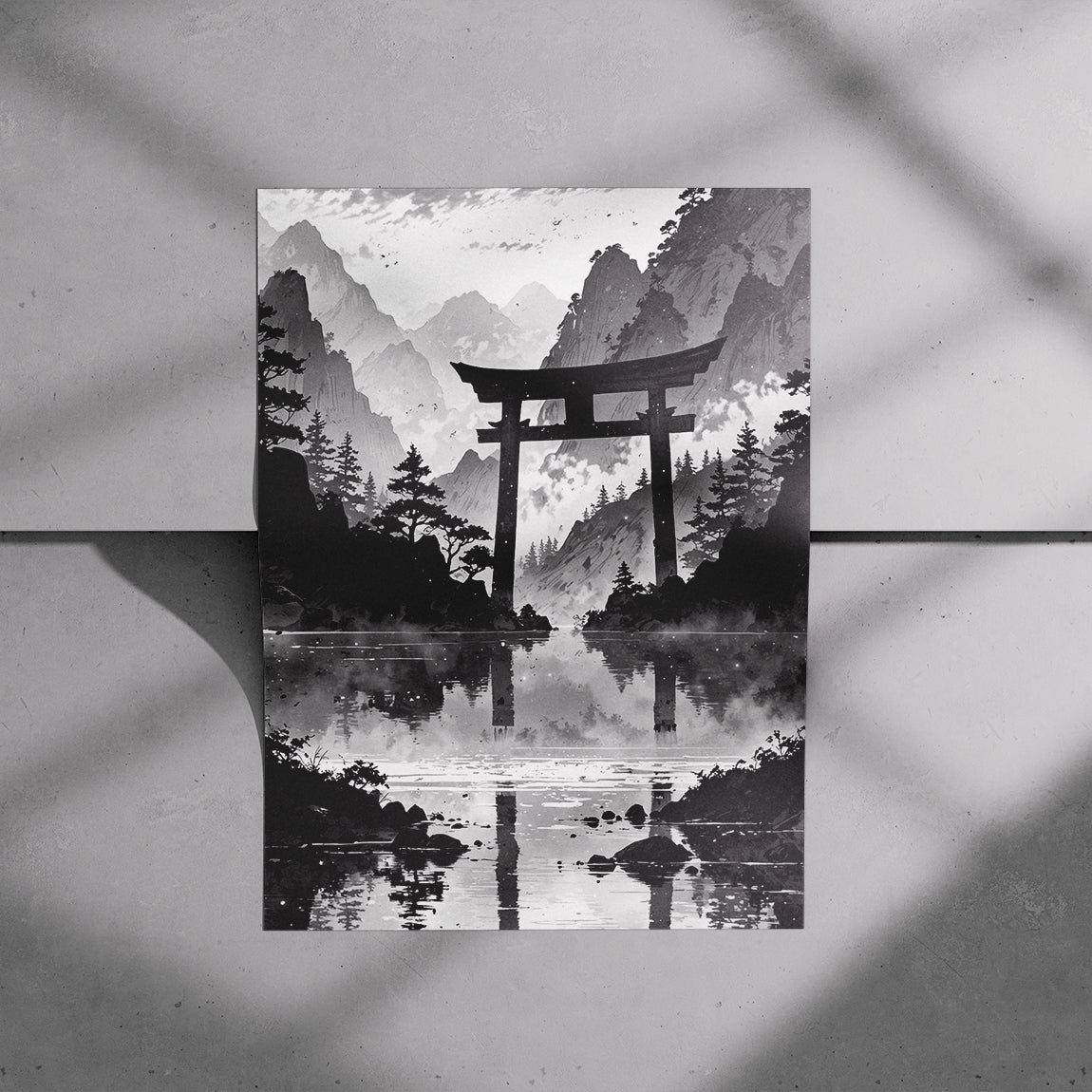A serene torii gate reflected in still water with misty mountains in the background. A peaceful, meditative Japanese landscape.