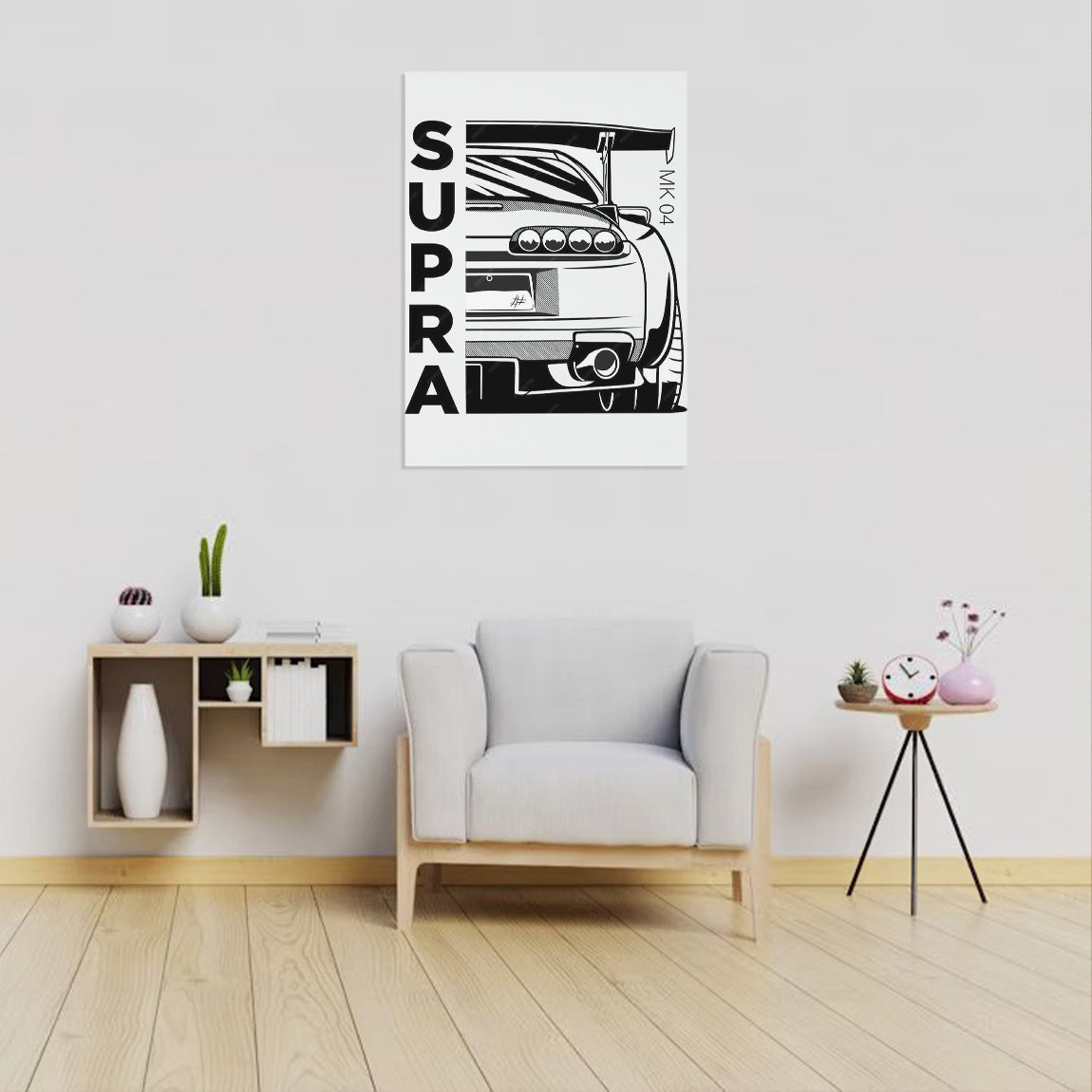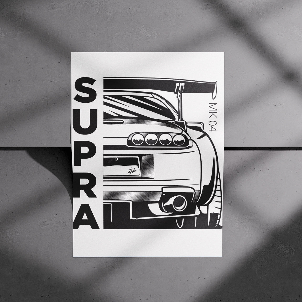 Minimalist black-and-white line art of the rear view of the iconic Toyota Supra MK4. Modern and bold, ideal for JDM fans.