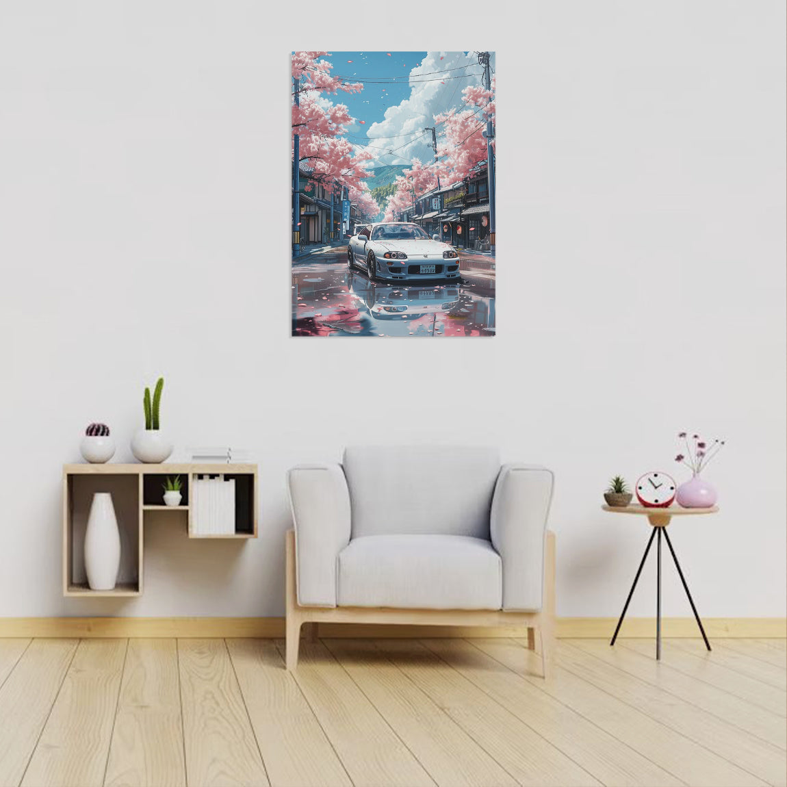 Stylish illustration of a Toyota Supra driving through a street lined with blooming cherry blossoms. Highlights Japanese aesthetic and car passion.
