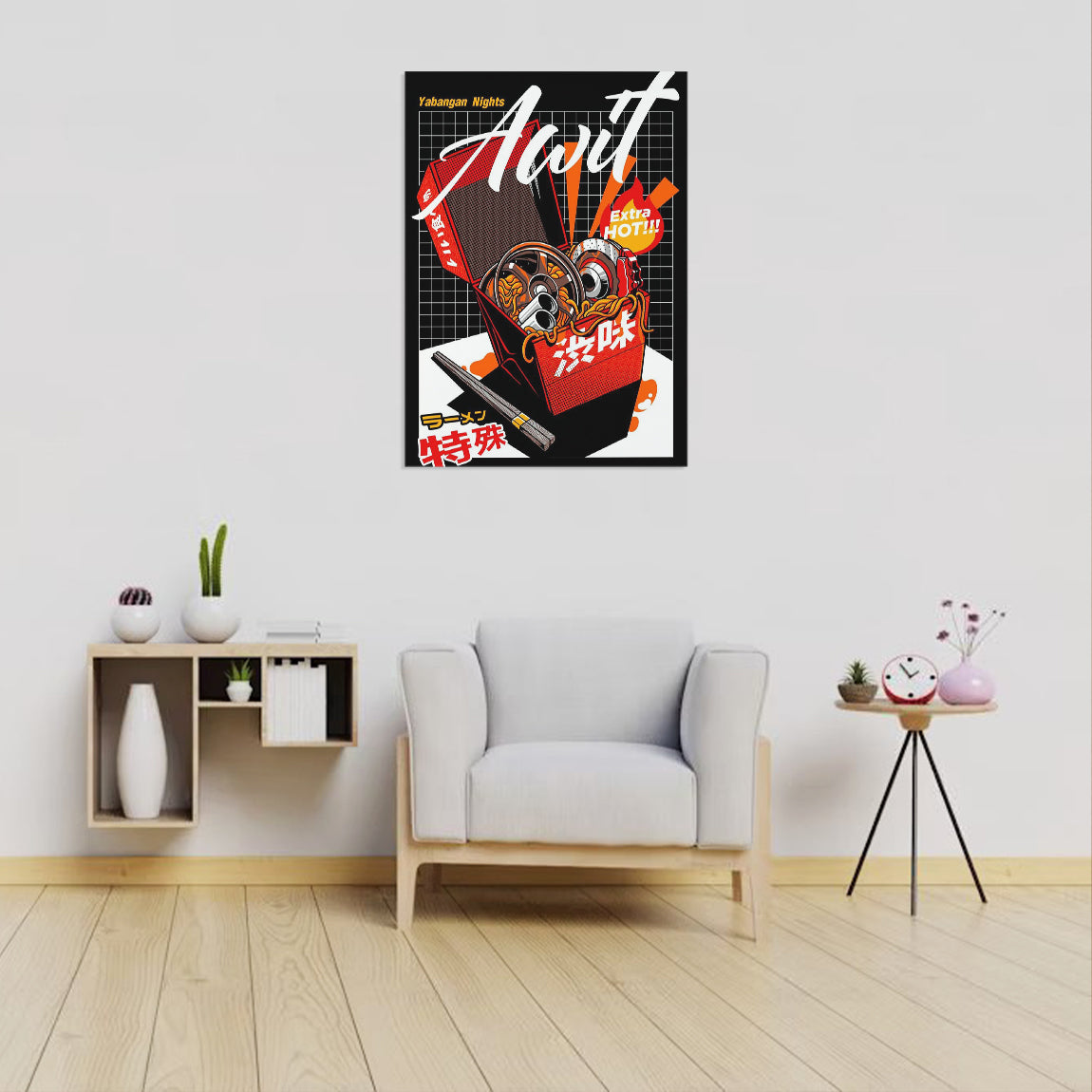 Playful and creative poster merging ramen noodles and turbo parts in a take-out box. Bright colors and Japanese text make it stand out in any collection.