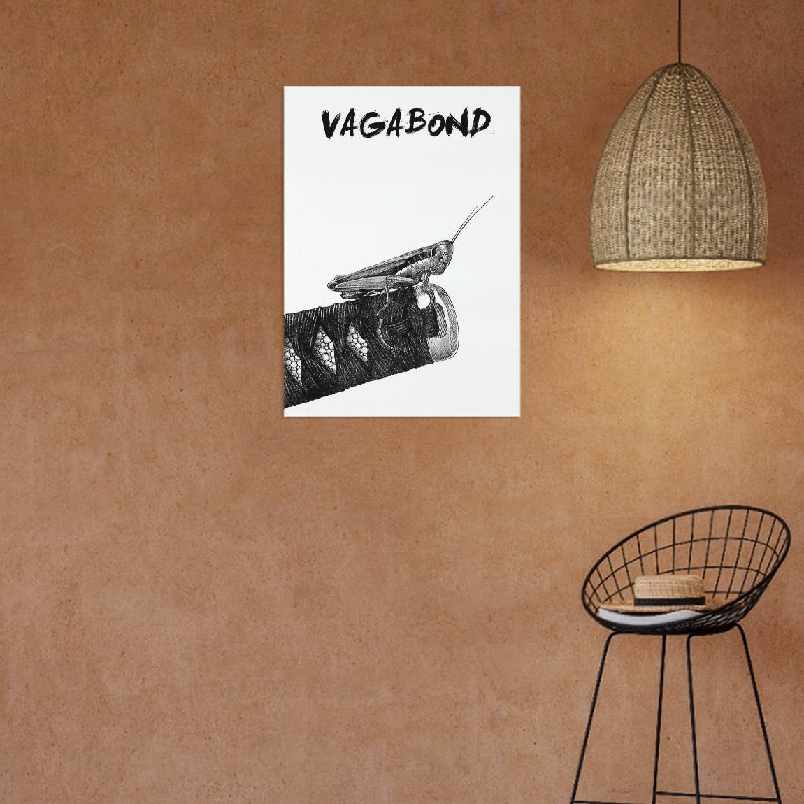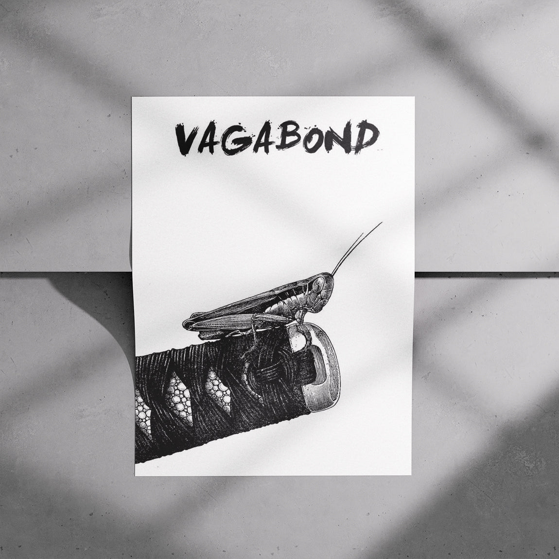 A minimalist illustration of a grasshopper perched on a katana hilt, from the iconic Vagabond manga series. Subtle and symbolic.